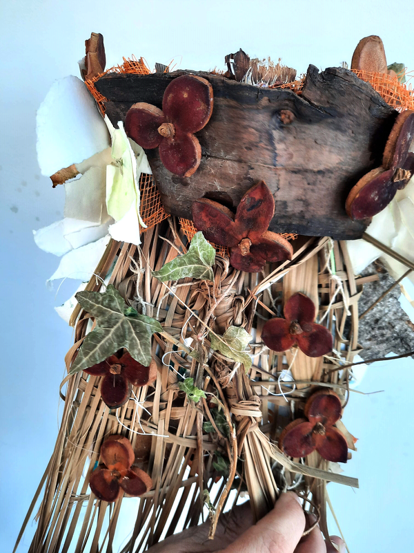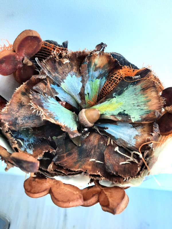 Tomando por base um pedaço de casca de árvore marcado pelo “desenho” similar a um umbigo e a uma cicatriz abdominal de um ventre e a experiência pessoal que cinzelou a minha pele por ocasião do parto, criei uma estrutura tridimensional semelhante a um manto decorado por elementos naturais e folhas fabricadas que envolvem uma única flor em forma de bouquet.