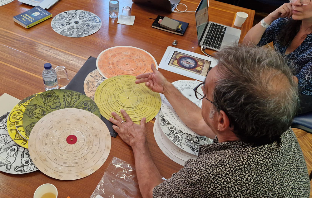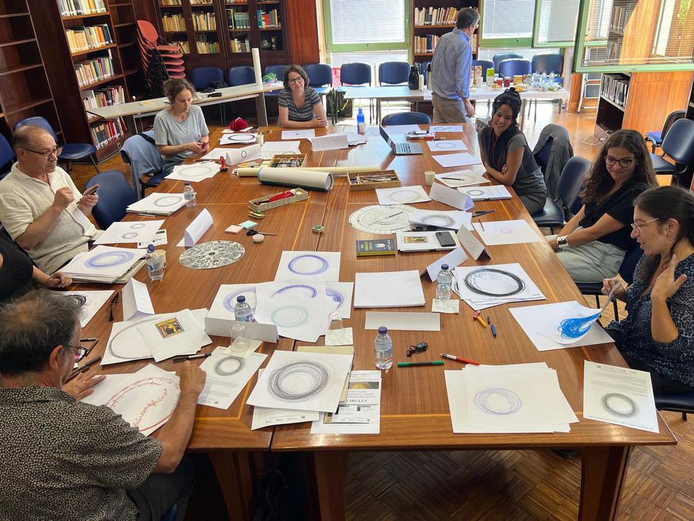 Em setembro, no workshop “Circles”, apresentei a volvelle como um dispositivo metodológico dinâmico – instrumento de pesquisa numa investigação em curso, no campo da arte-educação. Os participantes manipularam diferentes volvelles para explorar a combinação de conceitos, facilitando uma reflexão sobre a relação entre movimento físico - do girar dos discos do objeto - e movimento conceptual - do pensamento. Este exercício destacou ainda o potencial performativo da leitura das volvelles - enquanto forma de ensaiar interações dinâmicas entre corpo, mente e espaço.