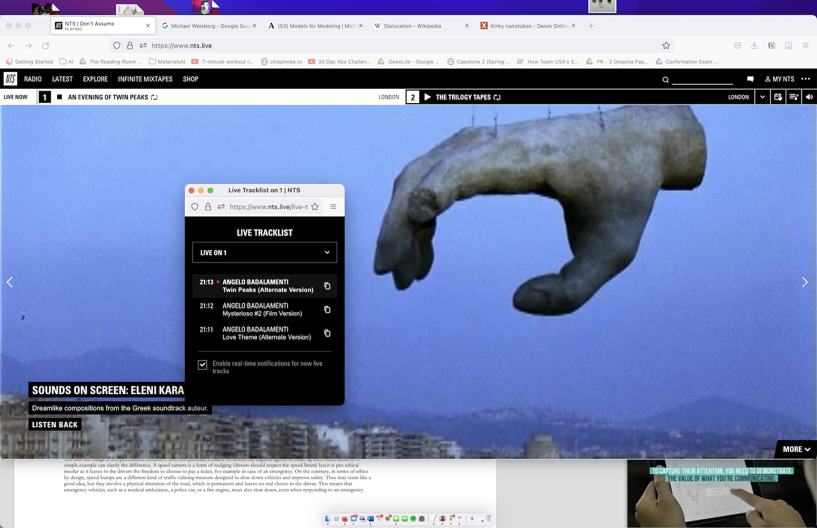 Angelo Badalamenti’s Twin Peaks soundtrack provides an aural dimension to the scene, as in a nearby browser tab scientists are developing squishy, kinky carbon nanotubes to soak up oil spills (O’Donnell 2012). Michael Weisberg, a philosopher of science focusing on climate change, sits next to a tab on “dislocation,” an apt if ominous prelude to climate change. A 7-minute workout, 30-day Ab Challenge, a Reading Room bookmarked folder, all become part of this portal of wormholes, deviations of dislocated defects along gliding planes – which is also the material-engineering definition of kinks.