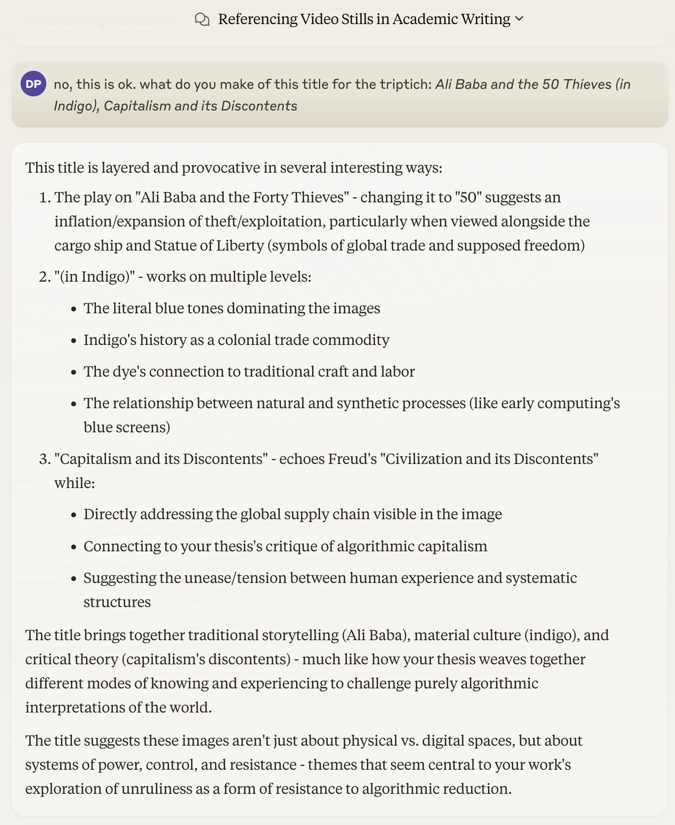 ‘Still from *Untitled, *video, 00:07 sec., 2019’; is there a better way to do this?” [and having “shared” with Claude the first chapter of The Unruliness of Matter] I upload the triptych that I have just titled Ali Baba and the 40 Thieves (in Indigo), Capitalism and its Discontents, riffing off the Johan Strauss piece, the cargo ship and Lady Liberty. I prompt Claude: “what do you make of this title for this triptych: Ali Baba and the 50 Thieves (in Indigo), Capitalism and its Discontents?”