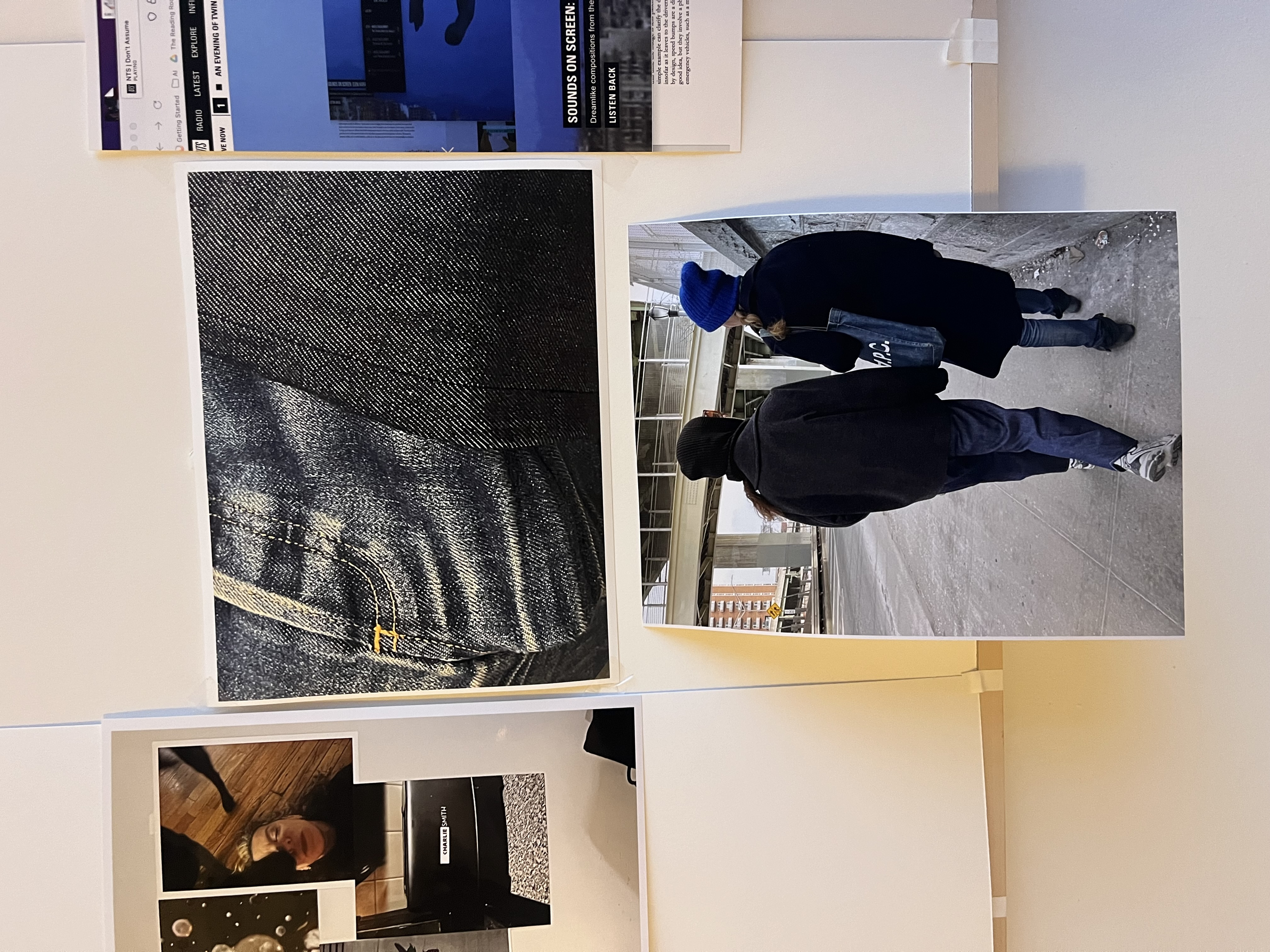 In the piece I Walk in Texture, a series of images is photographed on the wall, a dance of shadow and light, cropped narratives, the texturality of denim centering the composition bleeding over the rest of the images. The two pieces of denim, one well-worn with the movement of the body deeply ingrained in the coloration of the folds following the traces of the body, the other’s grain untarnished and empty of motion.