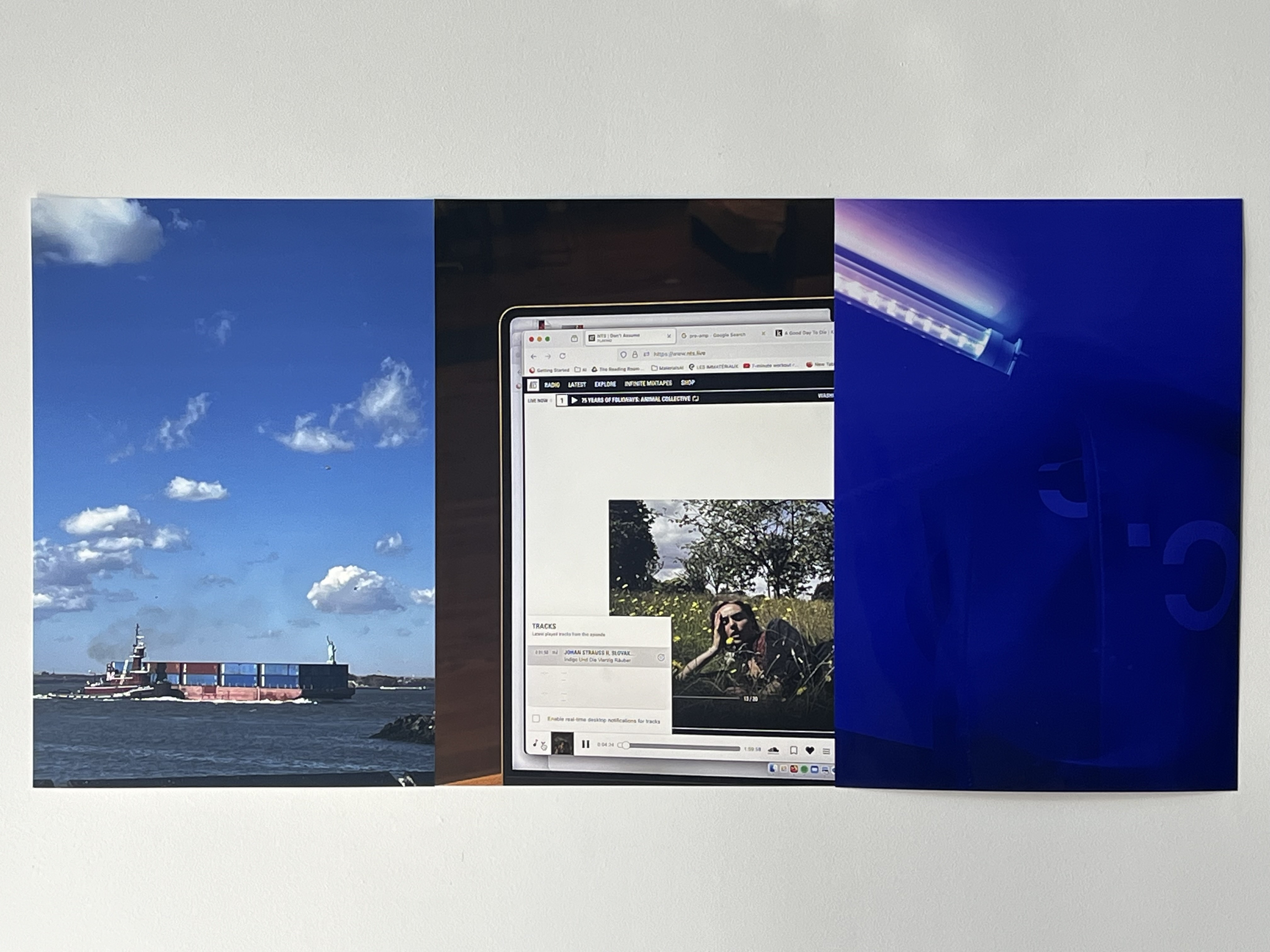 Most mornings I walk my dog by the Valentino Pier Park. Today, as we walk together and I look out to the horizon a cargo ship passes the Statue of Liberty, the ship's forecastle and Lady Liberty perfectly framing the loaded containers. It is a perfect day; the brightness and light remind me of September 11, even though it is November 1st, courtesy of climate change and the cargo ships. The same evening, at 10:22:50 PM, I take a photo of my computer screen; I like the music playing on NTS radio (a frequent companion in these travels), from Johan Strauss II’s, Indigo und die vierzig Räuber – it is easier than making a note of it in a piece of paper I will most likely misplace. Then another photo: a worn-out denim tote bag next to its brand-new twin under a UV light. I print all three images and tape them to the wall. I do not even really think about the Indigo in the Strauss piece and the blue of the UV light until I see them together, even though it is now such an obvious connection. The images themselves, as they sit next to each other, concoct an unexpected narrative, “ kinking” their individual meaning and revealing intricate pathways between them.