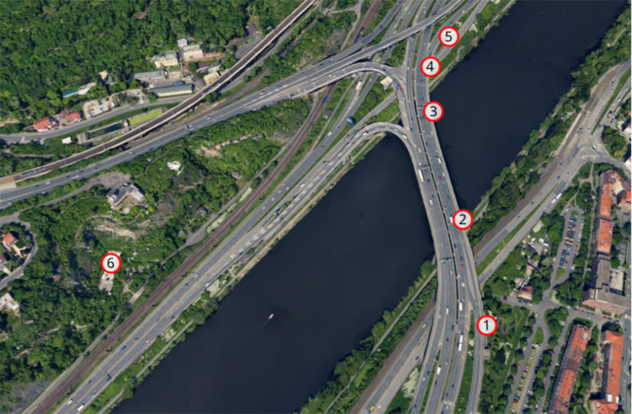 We approached the bridge from the southeast Braník entrance that gives access to the pedestrian/bicycle path. As we walked down the bridge, we stopped at a few spots that we believed could provide a rich sound source. The first thing we heard was the overwhelming noise of the construction work happening on the road; its sounds contributed to the overall soundscape. Additionally, as fewer lanes were available due to the construction works, the traffic was denser, which also affected the soundscape.