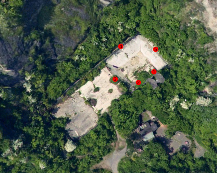 Another important technical decision that directly affected the aesthetic result was the loudspeaker arrangement. For two reasons, we decided on a multichannel arrangement that would completely occupy the space. First of all, we could not guarantee that everyone attending would fit or would want to be inside of the swimming pool. Naturally, we wanted to ensure that the experience was sonically rich at any position. Second, and more importantly, the sound definition on-site needed to do justice to the spectral complexity of the recordings. For that purpose, we performed inside the swimming pool with a Full-Range, 3-way Large Scale Stereo System next to us and three stage monitors located on the top edge of the swimming pool (Figure 12). The three of us would share the stereo system equally, but each of the stage monitors would be positioned in relation to our position “on stage.” Our idea was to fill the space from its main angles and on both floor levels. Next to the pool, to our top left, there was enough space for as many people as inside the swimming pool.