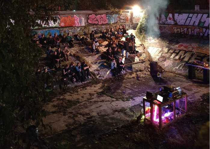 We wanted to blend in with the space as much as possible, often playing with the thin line between what was played back and what was happening live on-site. The event was a celebration of the poetically audible, an ode to noise.[5] We thought of it as a communal softcore-rave and child-friendly party, an “ecological horror”[6] which connected us and the audience to the environment through deep listening. The event was a practice of deep listening via the noise that composes the same environment in which it was being played, but beyond our human scale. We propose to call this a practice of listening via “Deep Recording.”