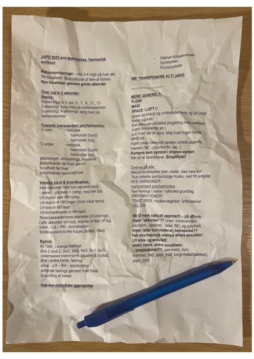 In preparing for how to instruct musicians and singers, as well as for the decision-making processes associated with the musical arrangements themselves, I revisited a piano methodological complex that I have developed over the years, which I’ve labelled towards transcendent polyharmonics in my own notes. This approach involves a series of exercises that all have a multi-dimensional purpose: to deeply familiarise oneself with the material while deconstructing any associations or habitual arrangements linked to it. Overall, the exercises aim to foster a profound auditory and tactile understanding of the material, and to enable the performer to experience an essential core behind the “normal arrangement” of the song. This practice involves a high degree of improvisation, within a wide range of strict dogmas, as I will outline in the following.