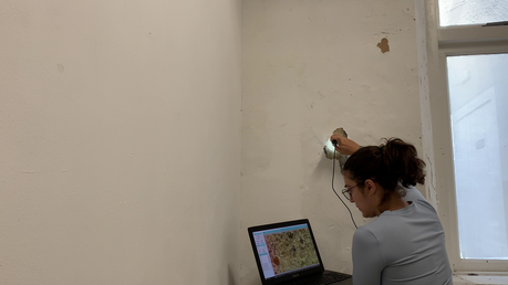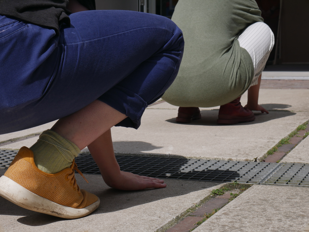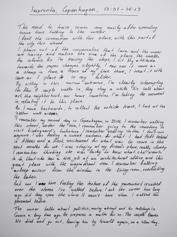 After a few attemps to stage the collection of the traced materials on the papers, I decided to instead use the collection to inform a new work altogether. I started developing "Meditation Exercises in Space", an audio guided experience where the spectators were asked to come in physical touch with the floor of an entrance (a place that they know and have been to before) and evoke memories that connect them with this place. This was an attempt to extract my personal experience in the places I was collecting into a methodology, aiming at finding that moment of connection between the space body and the human body.