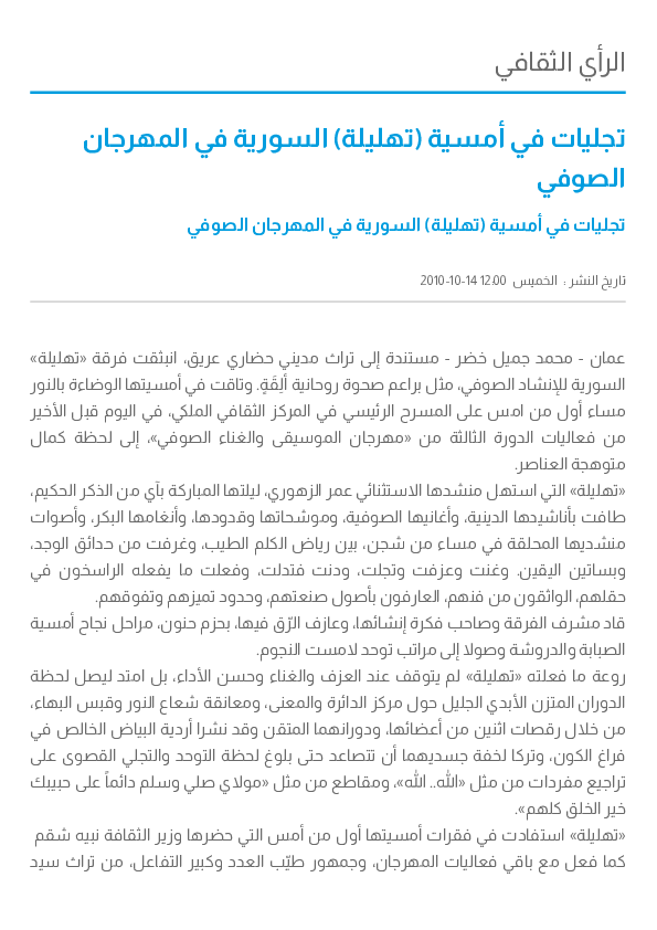 Here is a screenshot of an article about our contribution in a Sufi music festival in Jordan, the article describs the Sufi music style in Damascus and the enchanting, instruments and melodies.