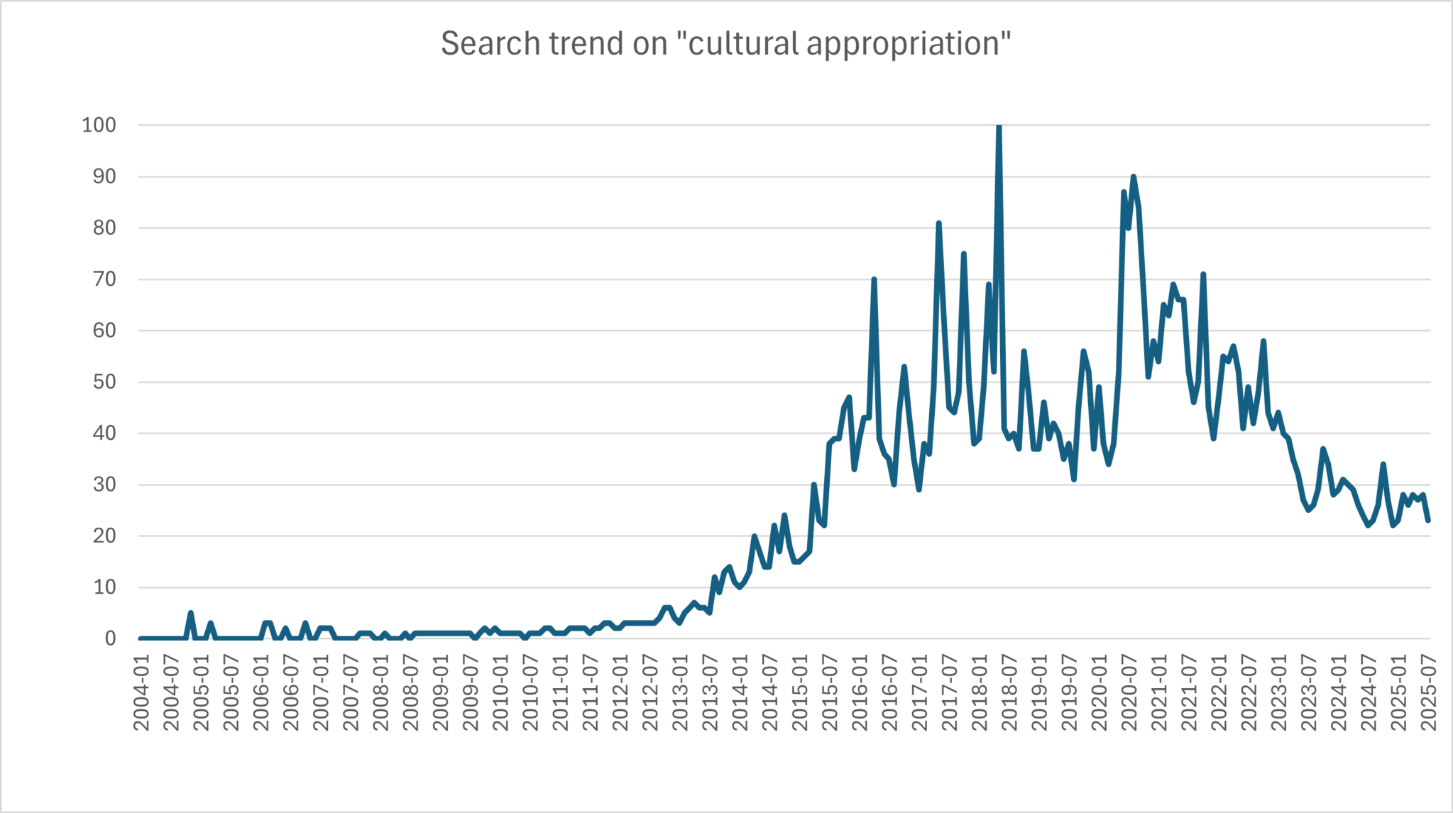 The trend on worldwide searches for the term on a popular search engine gives us an idea of how the interest of the general internet users for the topic have varied over time (Google Trends, n.d.). The chart on the side shows an index related to the number of searches, with an index 100 for the peak of searches attained in May 2018. It shows that the number of searches really starts to raise around 2012. It also shows a general envelope with a peak that has already passed, and we are now on the decline. This would seem to support the idea that the topic is indeed not new, but further than this, that the topic is getting old. Or at least the interest of internet users for it. Of course, that does not mean that the discussion is over, or that we have found all the answers.