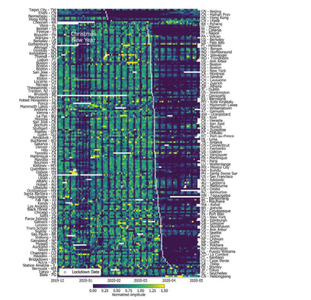 Figure 1: Global temporal changes in seismic noise. The daily global median is plotted, normalized to the percent variation of the pre-COVID lockdown baseline and sorted by lockdown date. Each line in the image corresponds to a seismic station. Data gaps are shown in white. Location and country code are given for each station. From Lecocq et al. 2020. Reprinted with permission from the American Association for the Advancement of Science (AAAS).