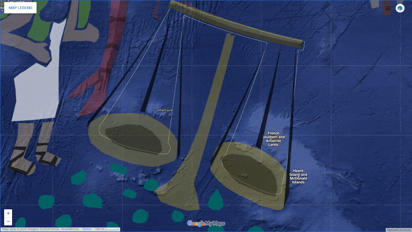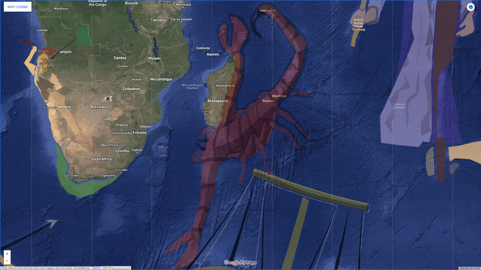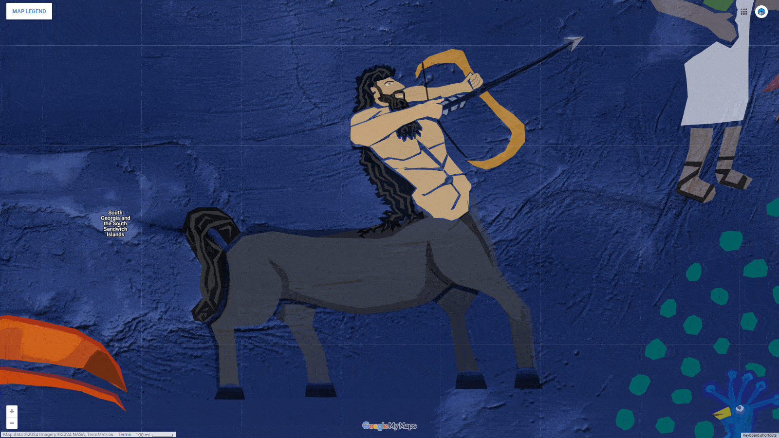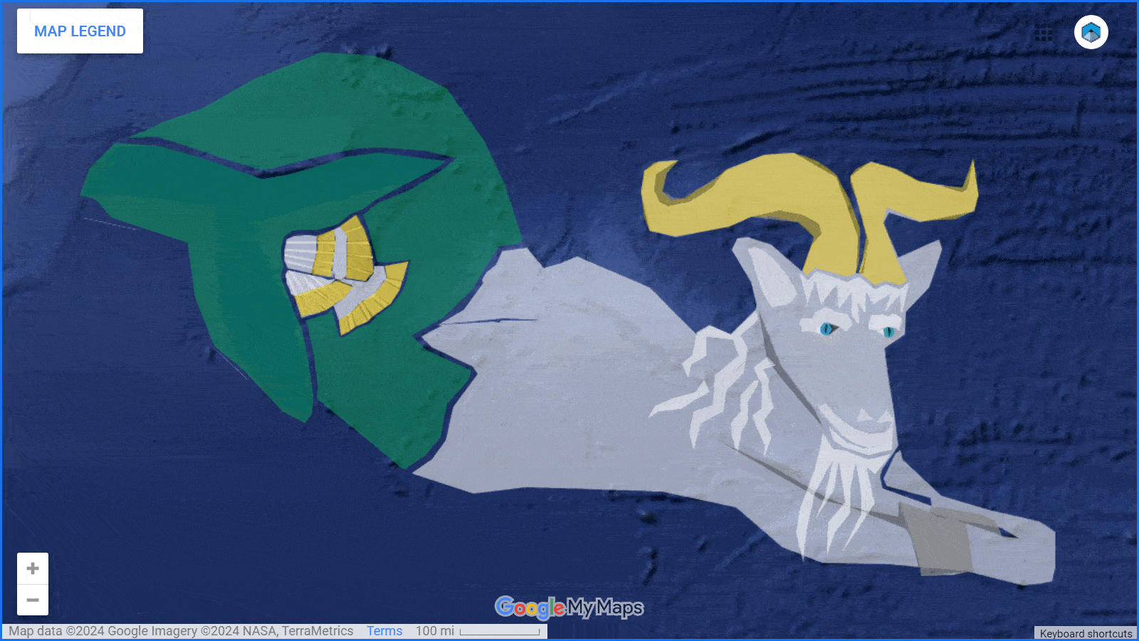 While viewing modern maps, I noticed that features on the seafloor resembled the same unusual creatures found in the Zodiac. I outlined those areas with polygons, shaded them different colors and exported the data into Google Earth. I tilted the virtual planet 23.5 degrees and when it started spinning, I watched in disbelief as my submerged zodiac danced in a circle around the cosmic ocean mirroring the movement of constellations in our night sky.