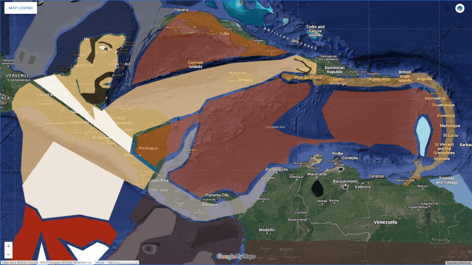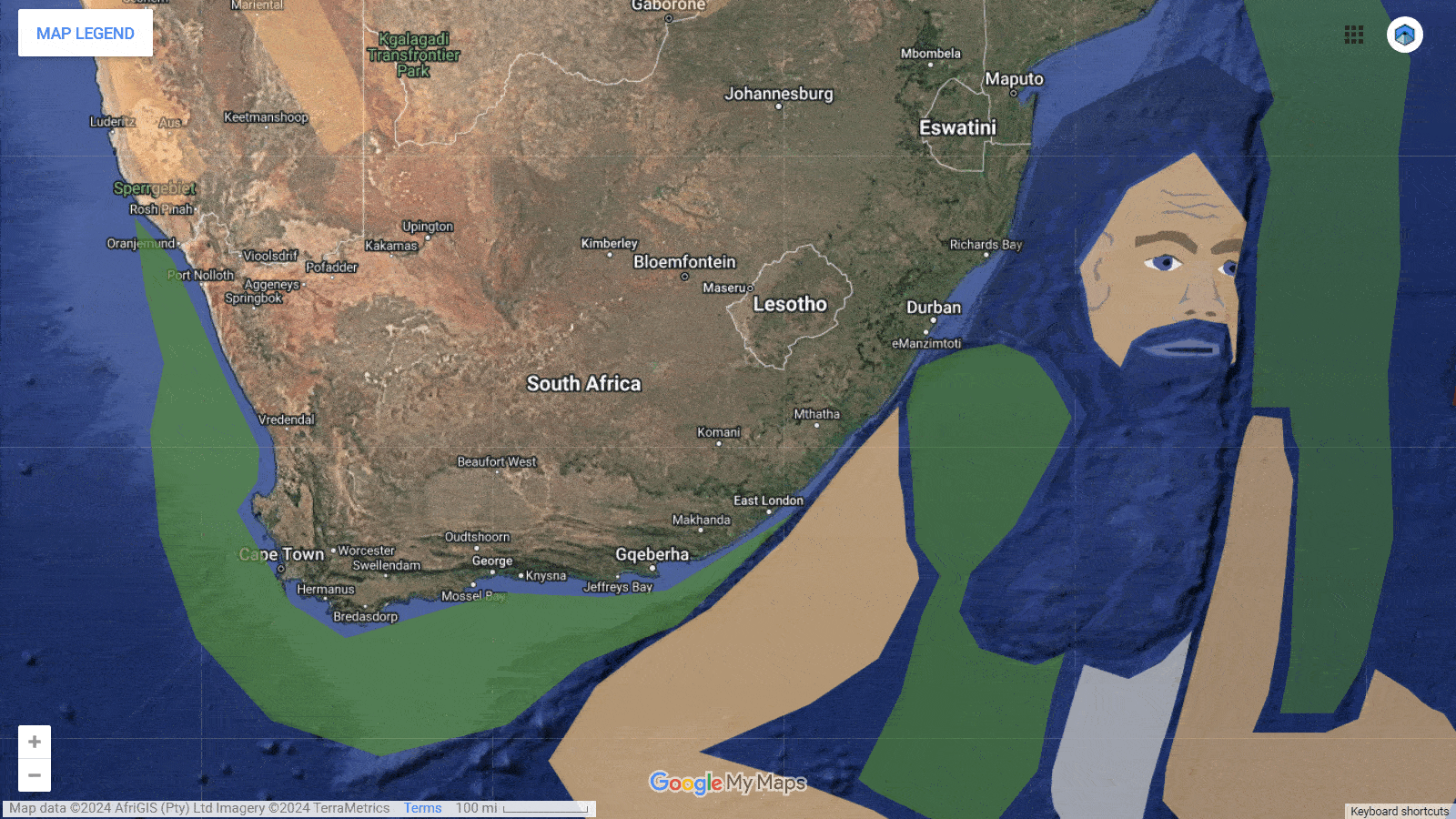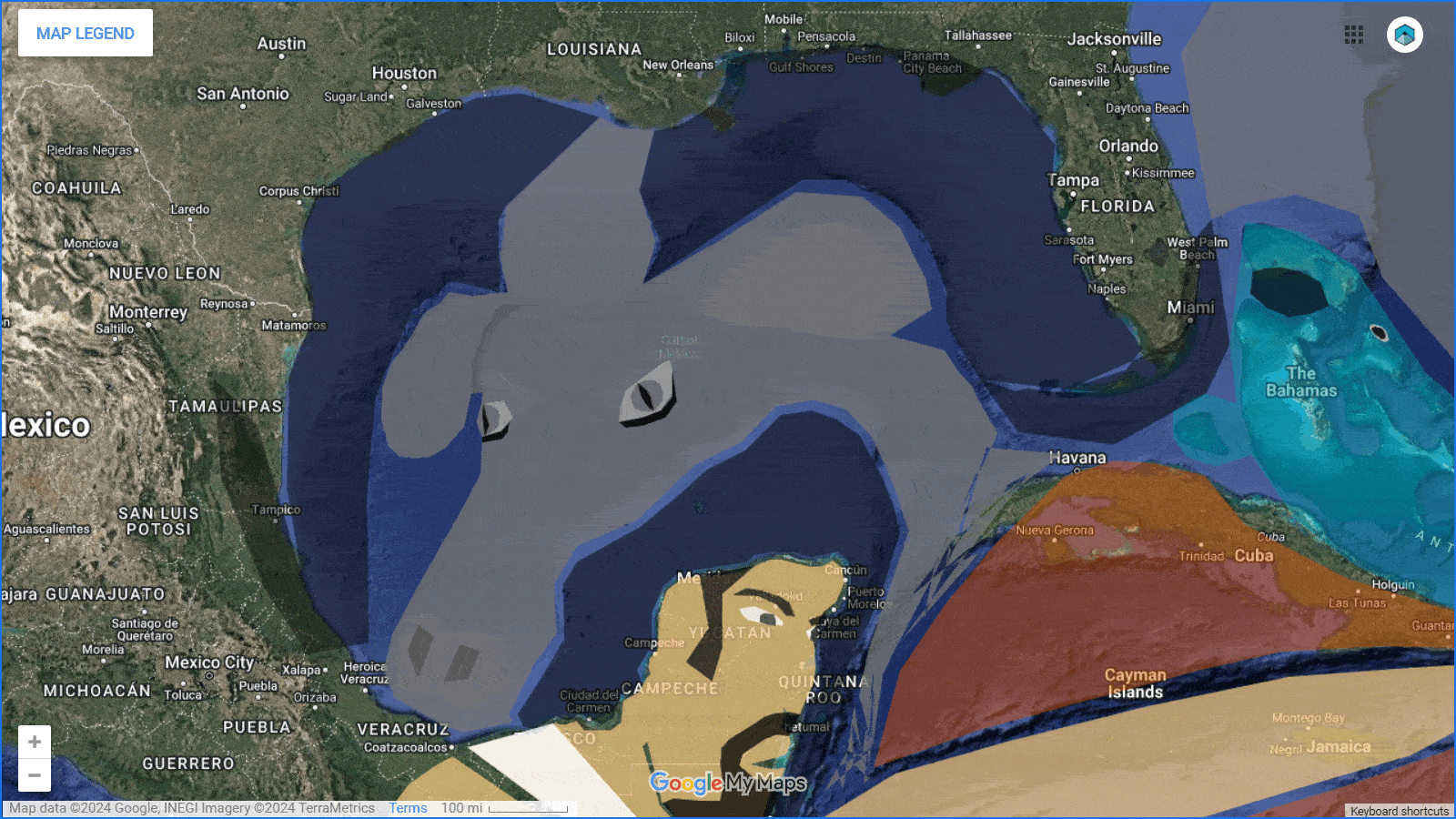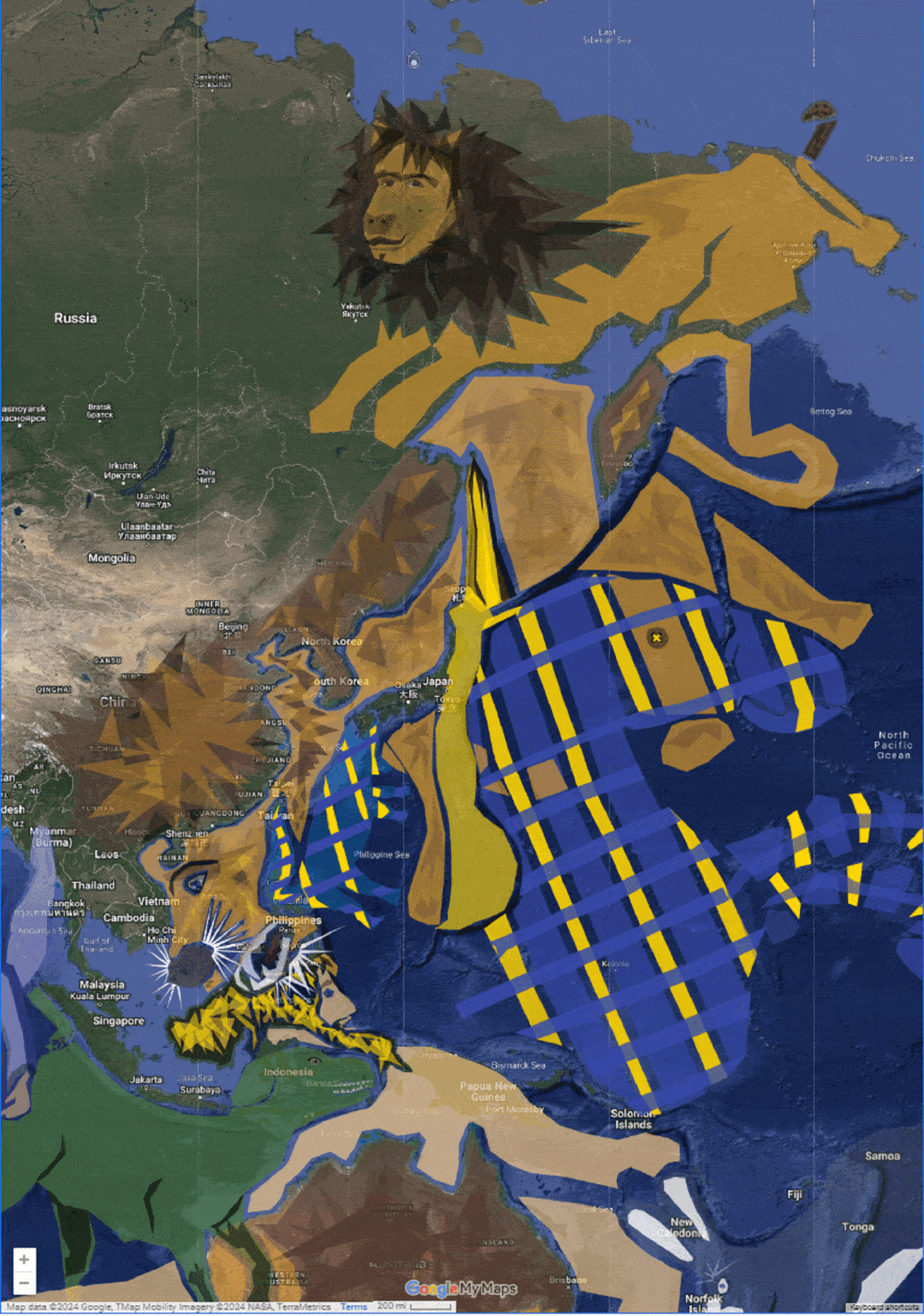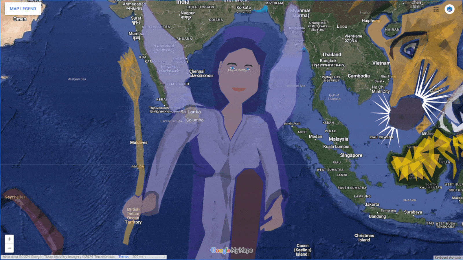 While viewing modern maps, I noticed that features on the seafloor resembled the same unusual creatures found in the Zodiac. I outlined those areas with polygons, shaded them different colors and exported the data into Google Earth. I tilted the virtual planet 23.5 degrees and when it started spinning, I watched in disbelief as my submerged zodiac danced in a circle around the cosmic ocean mirroring the movement of constellations in our night sky.