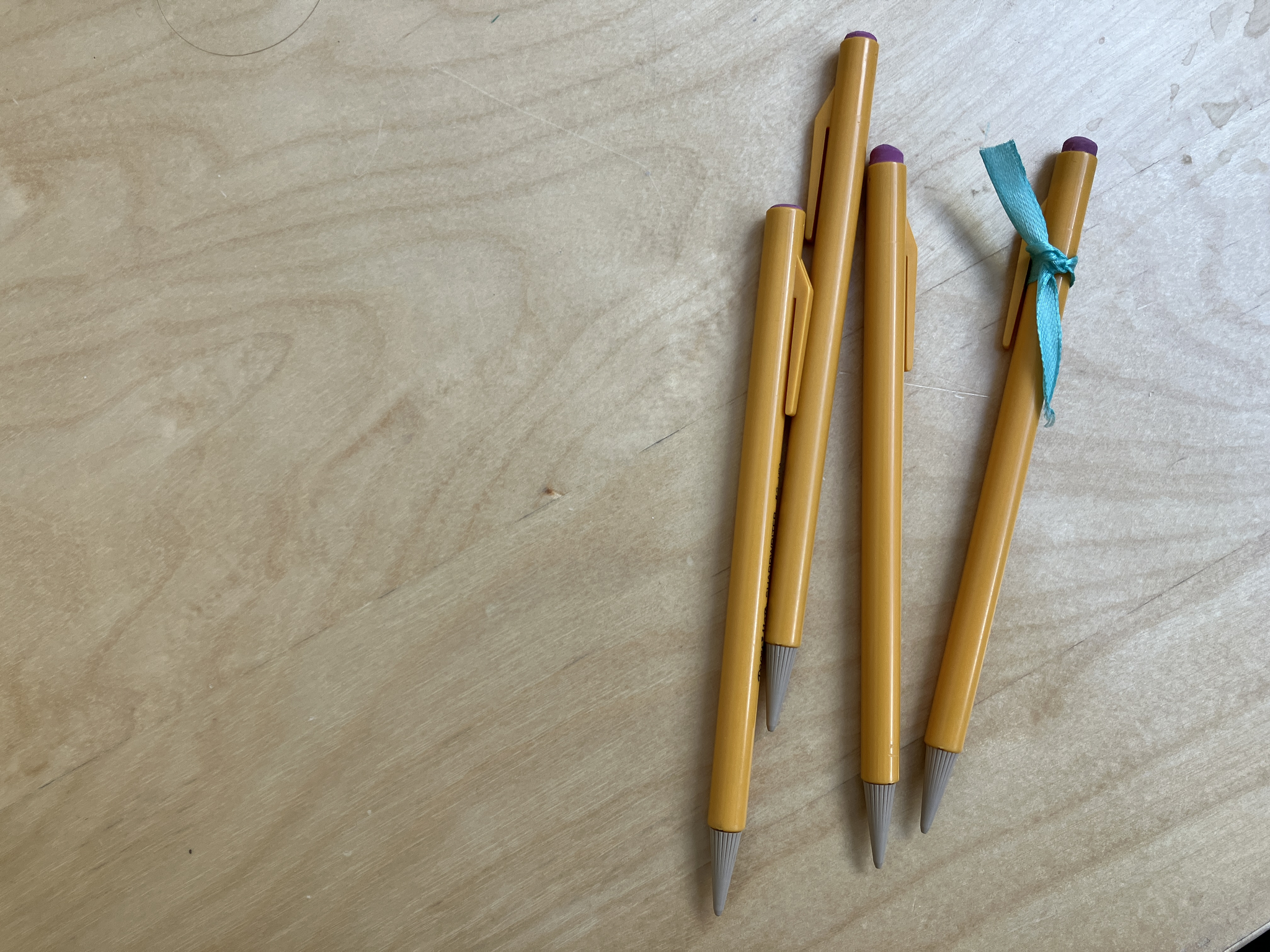 What do I interact with on a daily basis? A relative brings me mechanical pencils when she is visiting from abroad. At the moment, four identical ones are stashed in my backpack. I grab the one that’s already sandwiched into my notebook and tie some leftover ribbon around it, so that I can tell it apart from the others (its siblings?). Now this one will be getting special treatment, whatever that means, for the next 24 hours.