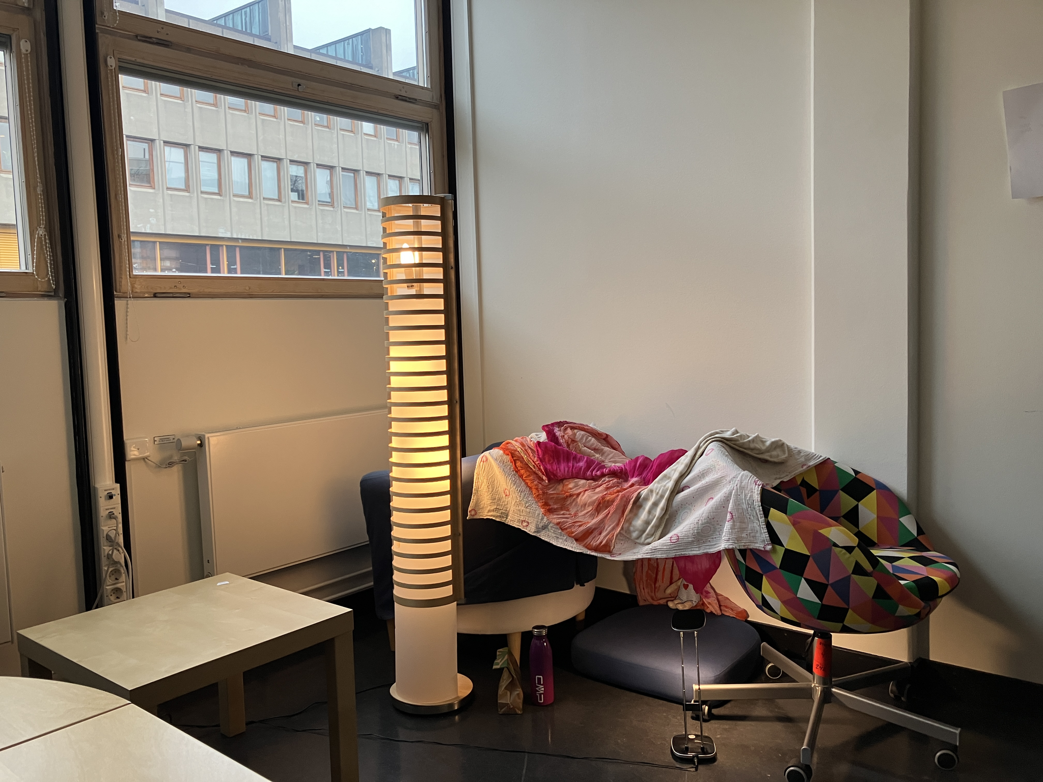 She suggests building something at work, using what I have in my office. I remind her that it’s mainly just furniture in there: office chairs and desks. Not missing a beat, she replies that I could build with a friend, and they could bring something from their office, and then we could chat or have a snack, presumably inside or on top of what we build. She also suggests bringing something from home, for instance pillows, but she acknowledges that my backpack is small and that not a lot will fit inside.