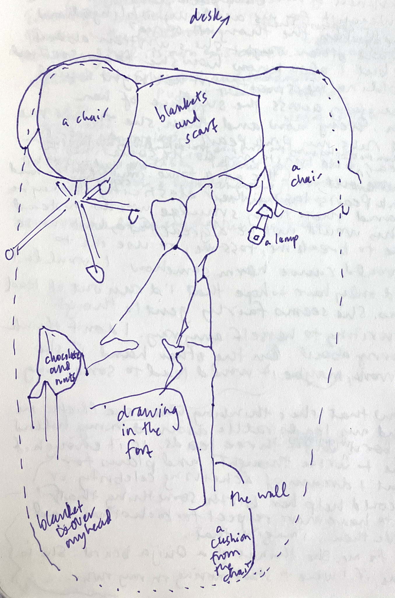 I carry on, arranging two chairs back-to-back, about half a meter apart. Into the small in-between space on the floor, I move the seat cushion from one of the chairs. This feels a little cavalier. Then I drape the blankets and my scarf over the chair backs to make a sort of tent. I illuminate the inside with a small desk lamp that I also place on the floor. I’ve readied the snack bag and my journal. Writing by hand these days can feel playful, since I usually write on my computer. But then I think, why not take a cue from my young family member and really go wild—by drawing? (Later, I remember that had been one of my initial ideas for what to do in the fort, but now it seemed inspired.) I’m not a visual artist these days, and drawing is certainly not something that I do at work. I dig up some colored pens and set my alarm for about 20 minutes, then carefully shimmy into the opening of the fort. Inside, there is just enough space if I stretch my legs.