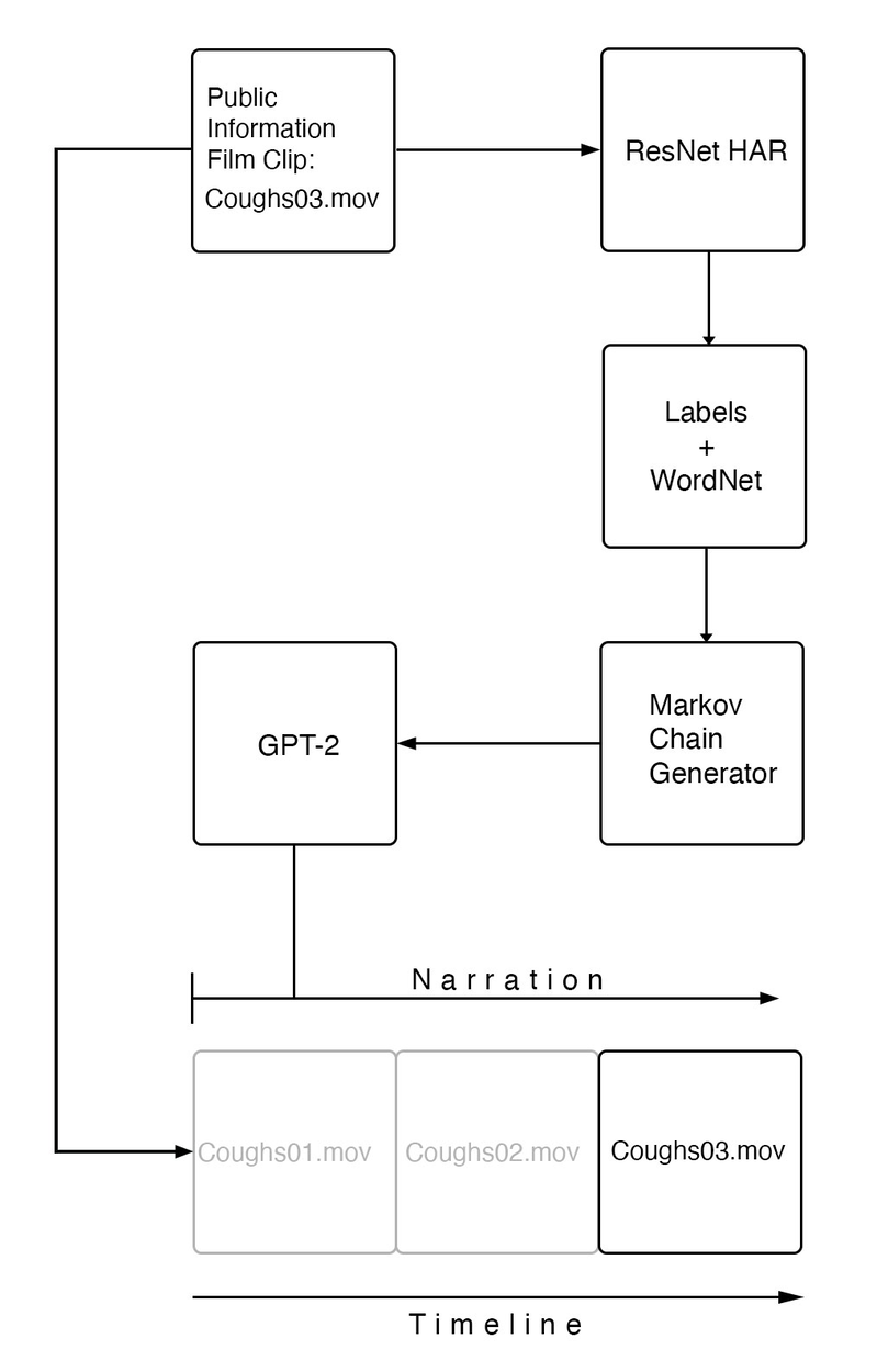 The following schematic (fig. 2) represents an assemblage comprising a number of different processes geared towards producing textual outputs in the form of categorical text labels and short sentences. After the initial HAR analysis of human action depicted in footage (fig. 3), there were interventions by the artist in order to curate lists of outputs, as indicated below in bold.