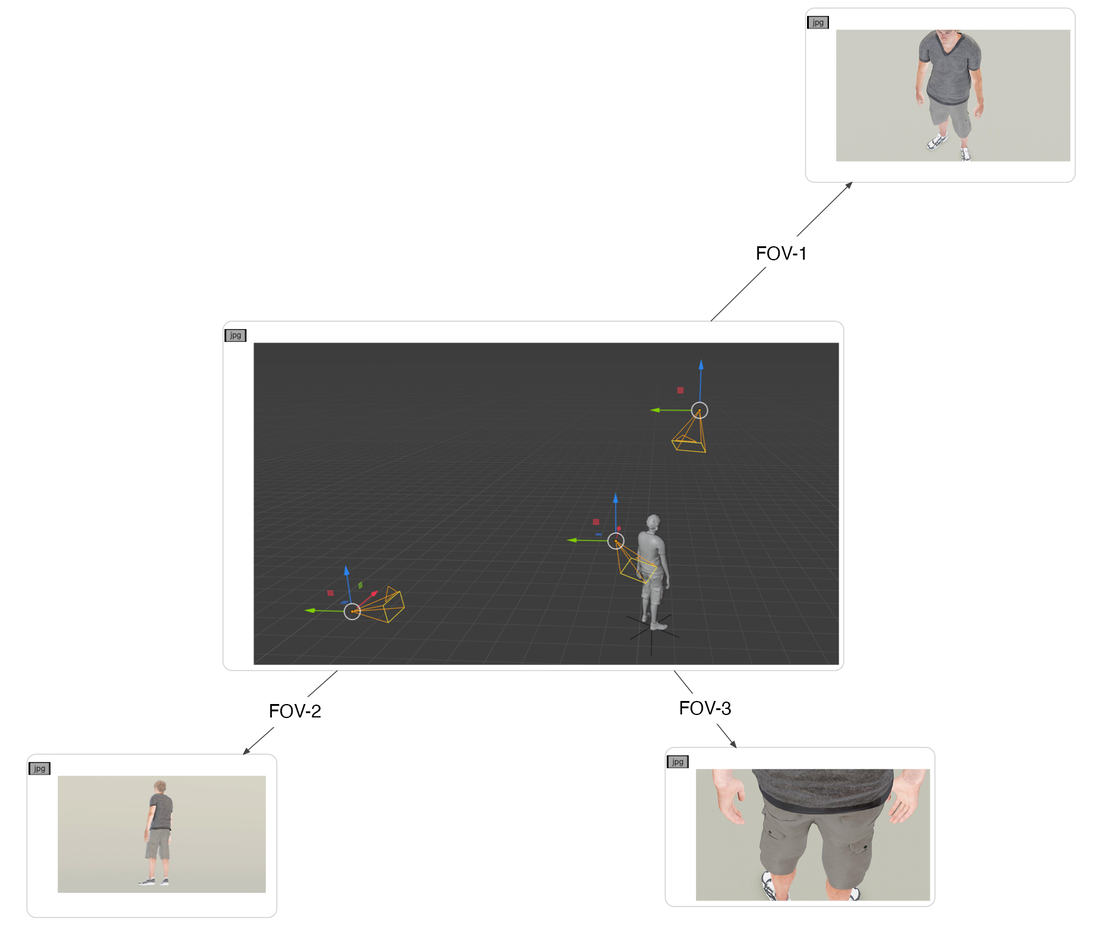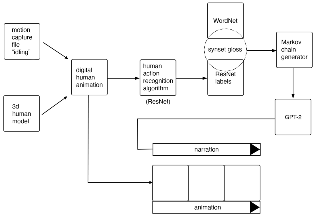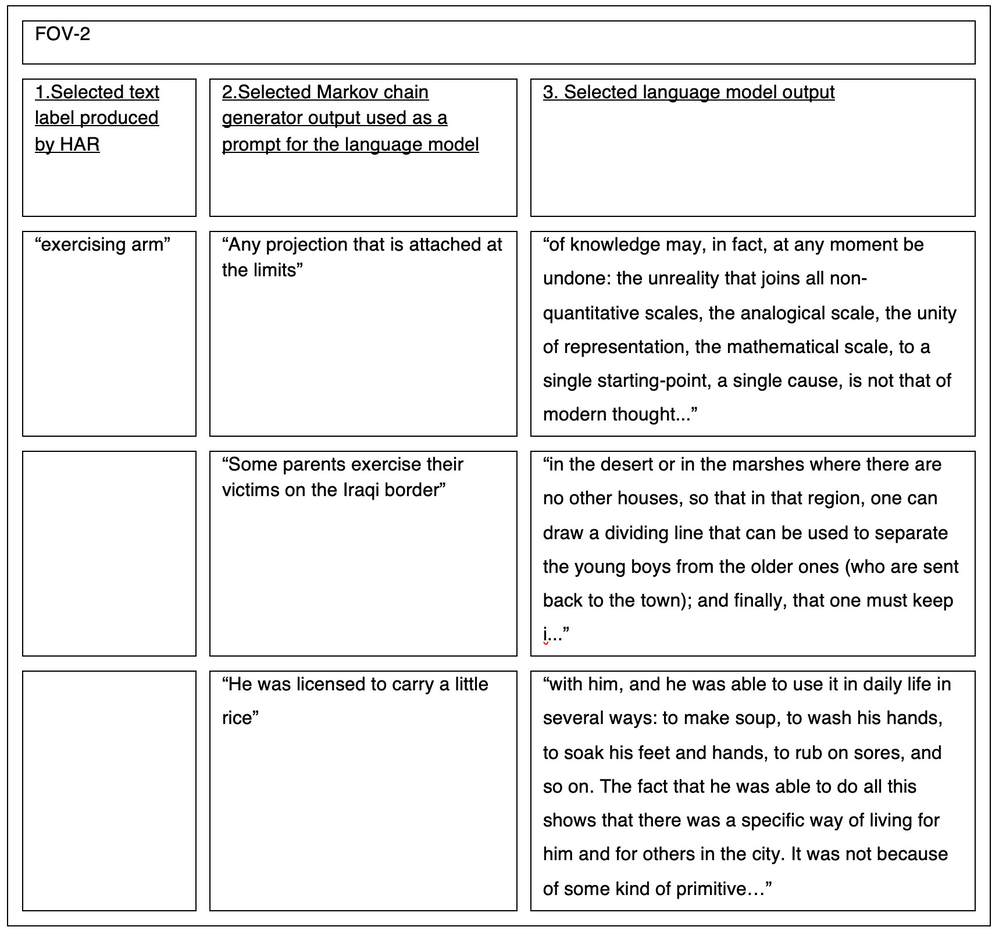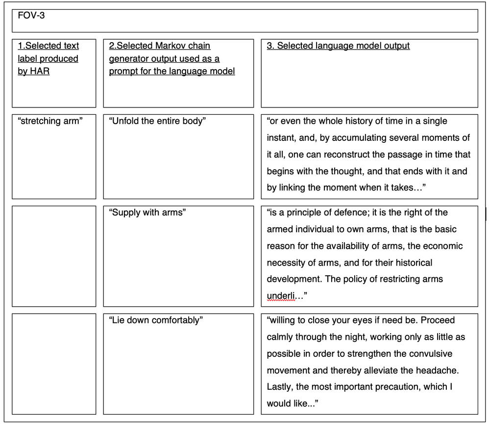 Similar to No_m_oN, this project was developed using the constraints of a mo-cap library, which provided the animation files for a series of digital human characters. The project focused exclusively on animations from the library’s “idling” category, a set of movements typically programmed into the mechanics of video games to run automatically as a default action. It was discovered that varying the field of view (FOV) of a camera within the virtual environment influenced the text label generated by the HAR system. By way of demonstration, three distinct FOVs have been selected for a character performing the same idling motion (fig. 16). For each FOV, three key pieces of information have been tabulated: 1) the text label produced by the HAR system; 2) text outputs from a Markov chain generator using the same HAR label; 3) a selection of autocompleted outputs by the language model (constrained to a maximum of 256 characters for brevity). Video 4 below is an extract from the 26-minute video animation Idling-in-the-Unreal, produced for the group exhibition CAN WE EVER KNOW THE MEANING OF THESE OBJECTS at Tickner Bell Young & Lebenson, Gallery 46, London E1, 2021.