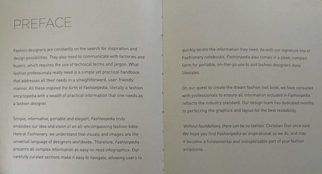 This seems a bit contradictory. Fashionary says they are aiming for the fashion designer but I'd say this preface is written for someone with minimal fashion knowledge or experience and wants to get the bread and butter to get started (or not)