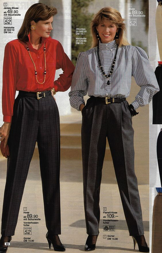 legwarmers, gymnastics / aerobics, shoulder pads, high waisted, oversized but sinched on the important parts, pleaded skirts, power suits and casual chique, bike / skisuits, fitness asthetic