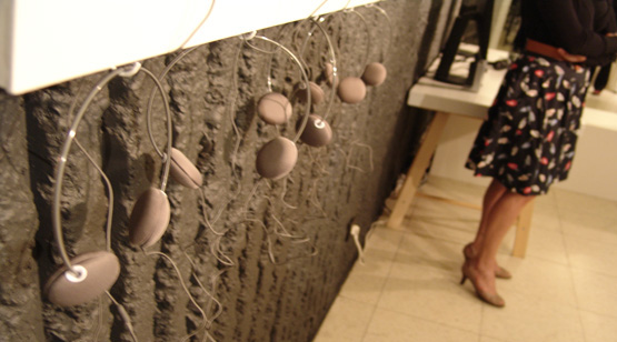 The decision was made to show the sound installation as part of the process and not as an isolated result. White wooden boards were built where the public could read a résumé of the research process and plug in headphones to listen to the five compositions. The video-documentation of the talks was also exhibited since it became a key aspect of the research. The videos were edited to emphasize the conversations regarding sound, but exposing the gestures and manners the former miners used to communicate their sound memory. Sometimes they would describe or make up sounds and, by trying to imitate them, many new sounds came up, provoking excitement and at times disturbance.