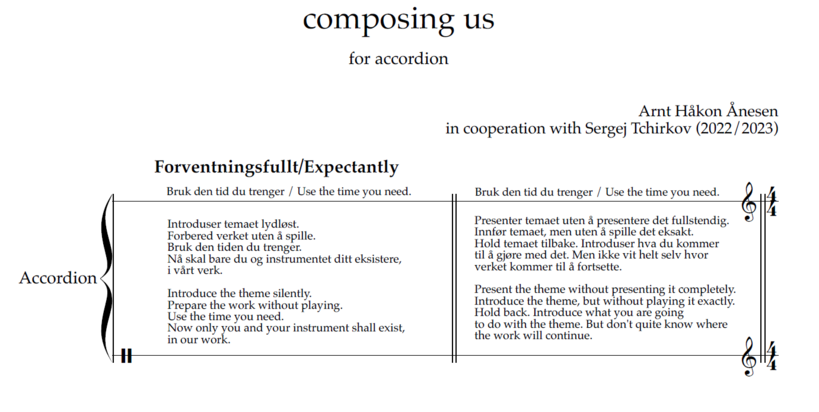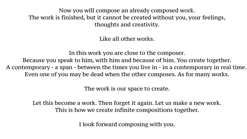 Developed from an artistic statement within my practice, the Shared Space has become for me a method, and a dynamic environment where the production of musical meaning(s) arise(s) from the interactions between various agents, including the performer, the score, the instrument, the listeners, and the surrounding context. Its theoretical grounding draws from research conducted by both practitioners and theorists, particularly those who challenge the notions inherent to the regulative work-concept, and the power relations in music (Torrence 2018; Hellstenius et al. 2023; De Assis 2018; Rink et al. 2018; Goehr 1992). It is further influenced by Michel De Certeau’s concept of space as a "practiced place" (Certeau 1988, 117), Böhme’s (2017) theory of atmospheres, as well as my own artistic and personal experiences (Tchirkov 2022). The Shared Space acknowledges that meaning is not pre-determined but emerges through the active and responsive engagement of all these agents in real time. Referring to Böhme’s theory, similarly to atmospheres, characterized by the “co-presence of subject and object”, the shared space in music can be viewed as a space though which “affective and emotional aspects of human lives … unfold” (Bille 2018). According to Böhme, “music occurs when the subject of an acoustic event is the acoustic atmosphere as such, that is, when listening as such, not listening to something, is the issue” (2000, 17) The objective of the performer and composer is thus primarily to create a set of conditions for the emergence of the specific acoustic event – and this is also the driving impulse of the Shared Space.