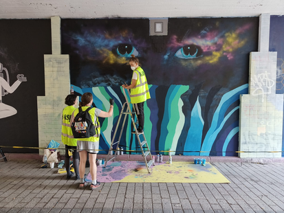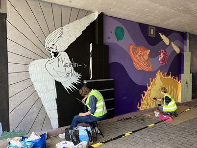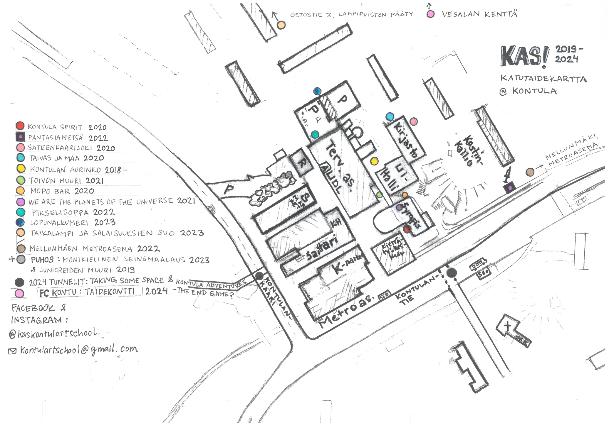 Tässä ekspositiossa (KAS-kuvagalleria) voit tutustua KAS! Kontula Art Schoolin aikuisten kollektiivin jäsenten elokuussa 2024 toteuttamaan Taking Some Space -seinämaalauskokonaisuuteen ja työskentelyprosessiin. Maalauspaikka (Emännänpolun alikulkutunneli) sijaitsee Kontulan ostarin välittömässä läheisyydessä. Ekspositio mukailee taiteellisen toimintani logiikkaa: toiminta sijoittuu konkreettiseen paikkaan, Itä-Helsinkiin ja Kontulaan, kartalle. Maalaamme kartalta tarkemmin rajattua paikkaa, jonka ympärille alkaa kokoontua toiminnan myötä joukko erilaisia ihmisiä, jotka tekevät erilaisia taideteoksia. Nämä ihmiset tekevät samalla myös paikan: ottavat sen haltuun ja määrittelevät sen käytöstä. Eri ihmisten kokemukset paikasta voivat vaihdella ja olla myös ristiriidassa keskenään, jolloin paikkaan kohdistuu erilaisia taiteellisia ja sosiaalisia neuvotteluja. Mitä syvemmälle paikkaan sukeltaa, löytyy sieltä myös kaikki se hiljainen tieto, joka näkyvien teosten pinnan takana on olemassa. Tätä hiljaista tietoa pyrin avaamaan (yhteisö)taiteellisen (toiminta)tutkimukseni avulla. KAS katutaidekartalla näet myös aiemmin Kontula Art School -hankkeen aikana (2019-2025) toteutettujen julkisten ja yhteisöllisten teosten sijainteja ja nimiä. Kuvagallerian prosessikuvien valinnassa olen käyttänyt (tutkimus)eettistä harkintaa. Olen myös halunnut nostaa esille erityisesti erään työparin teosta, joka kärsi maalausprosessin aikana sekä töhrimisestä että kriittisesti keskeneräisen teoksen päälle ennenaikaisesti levitetyn suoja-aineen ja sen poistamisen aiheuttamista vahingoista.
