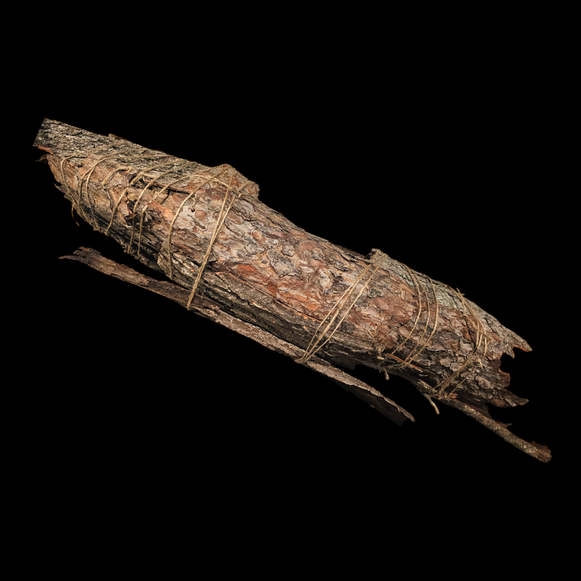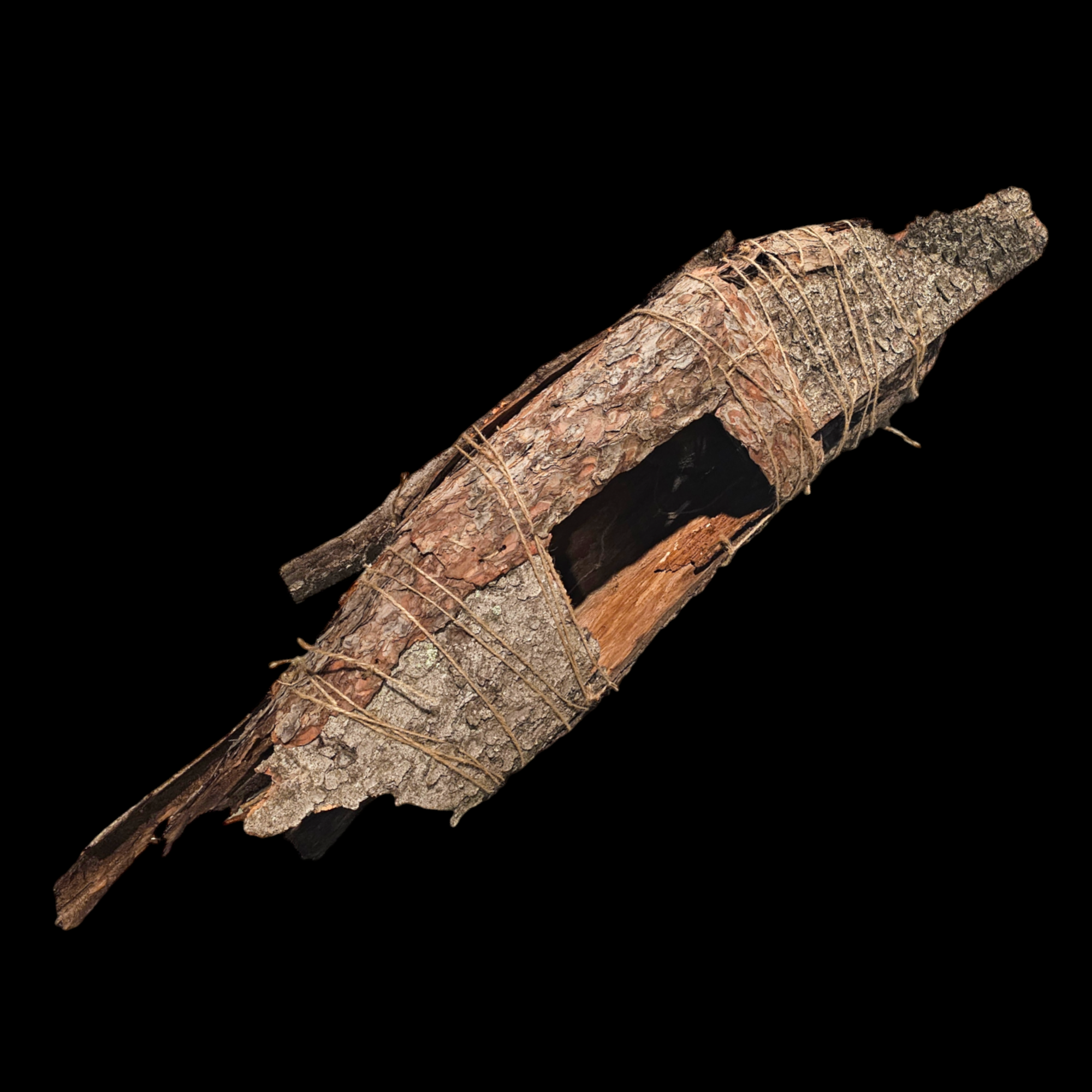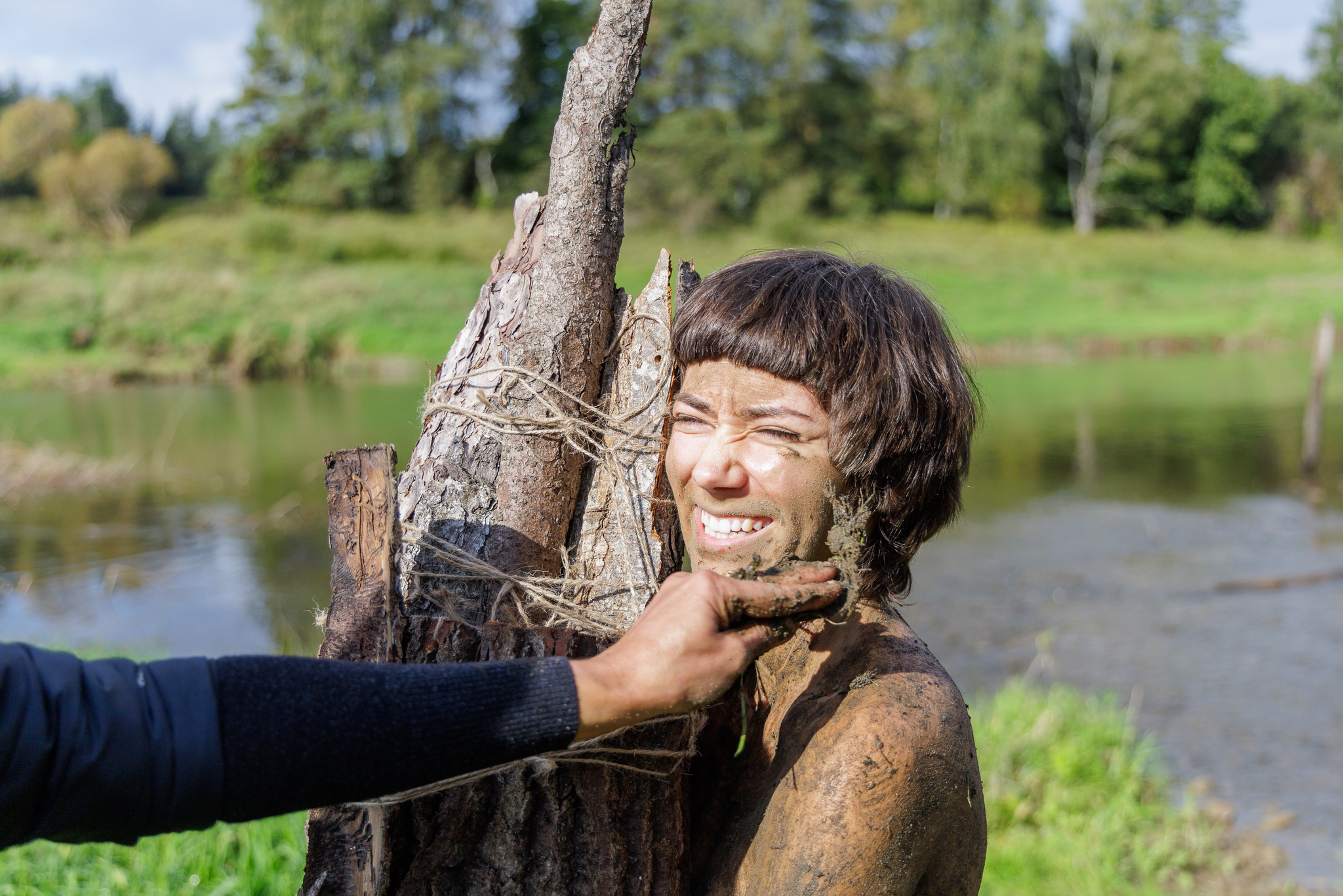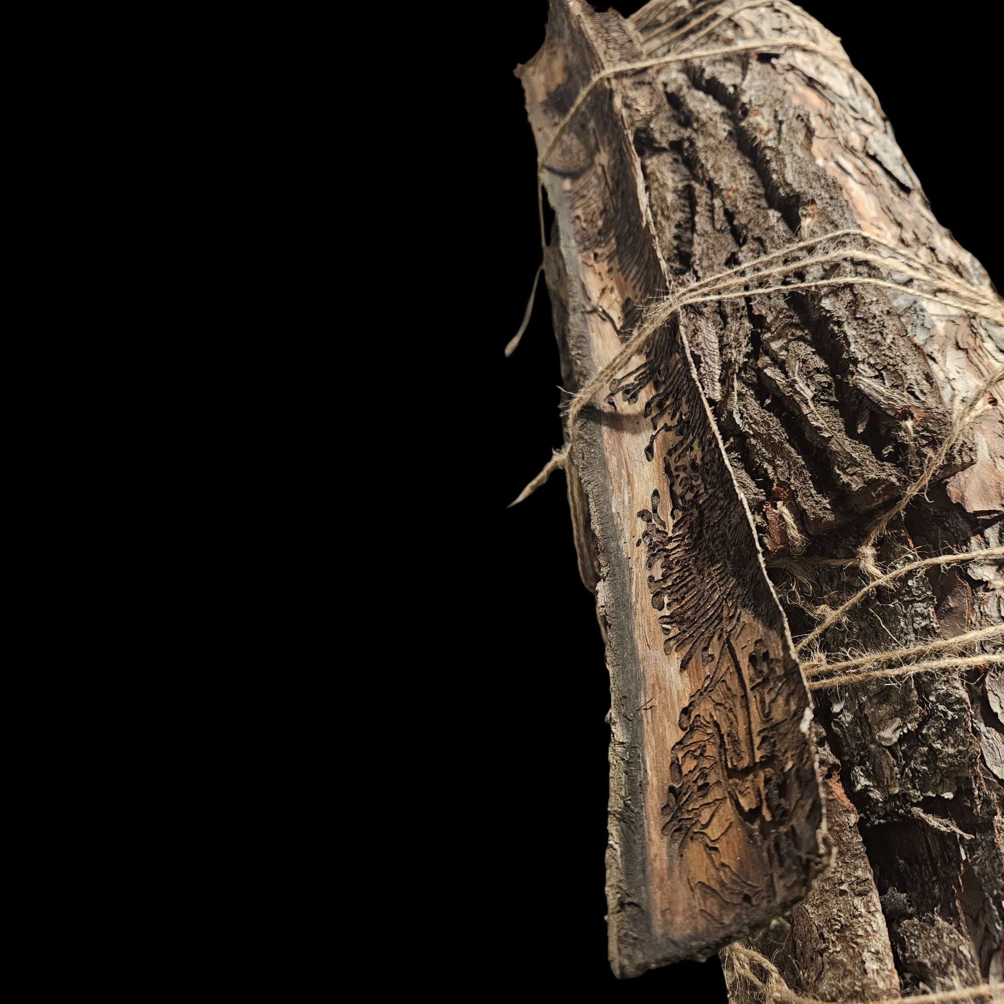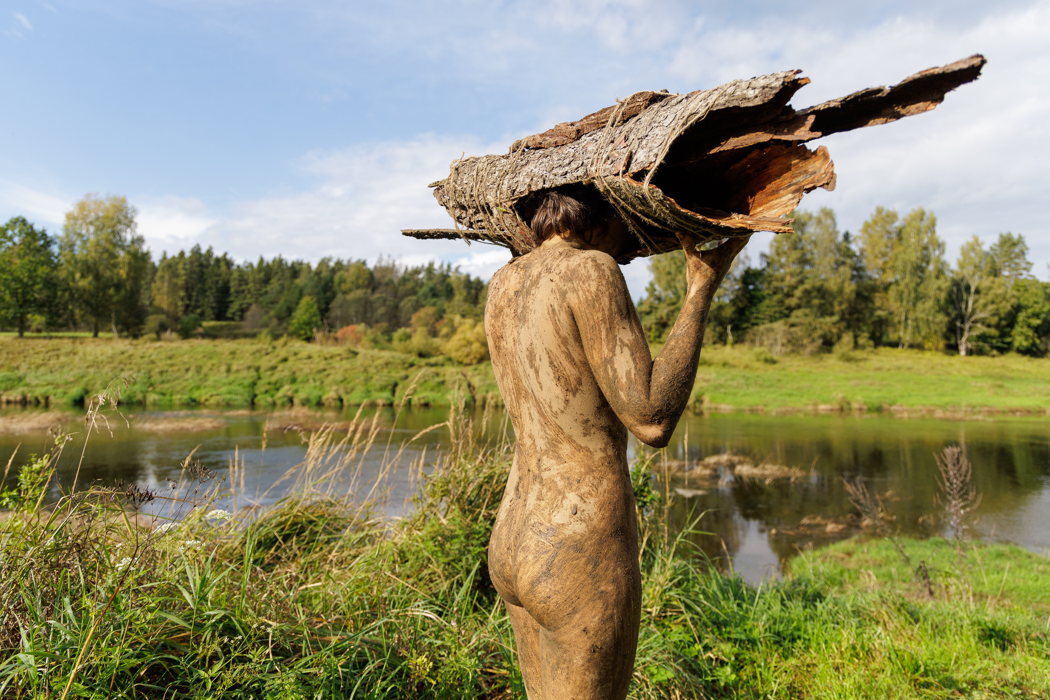 Numa tentativa de reconexão profunda entre o ser humano e a natureza, foi concebido um dispositivo simbólico, a que decidi chamar "facilitador do ver e do sentir". Este objeto, embora simples, revela uma intenção complexa. Trata-se de um tronco de cascas de madeira, cilíndrico, composto por madeiras cozidas e entrelaçadas com corda de sisal, com um buraco no centro que permite a inserção da cabeça, evocando a forma de um capacete. Através desta criação, procurou-se, de forma intencional, anular a presença física de um corpo feminino, integrando-o na paisagem circundante da floresta e do rio de Kuldiga. Esta fusão ocorre tanto através da imagem fotográfica como do vídeo que documenta a ação, onde o corpo nu se dissolve e se entrelaça com o ambiente, até se transformar em algo indissociável da floresta e das águas.