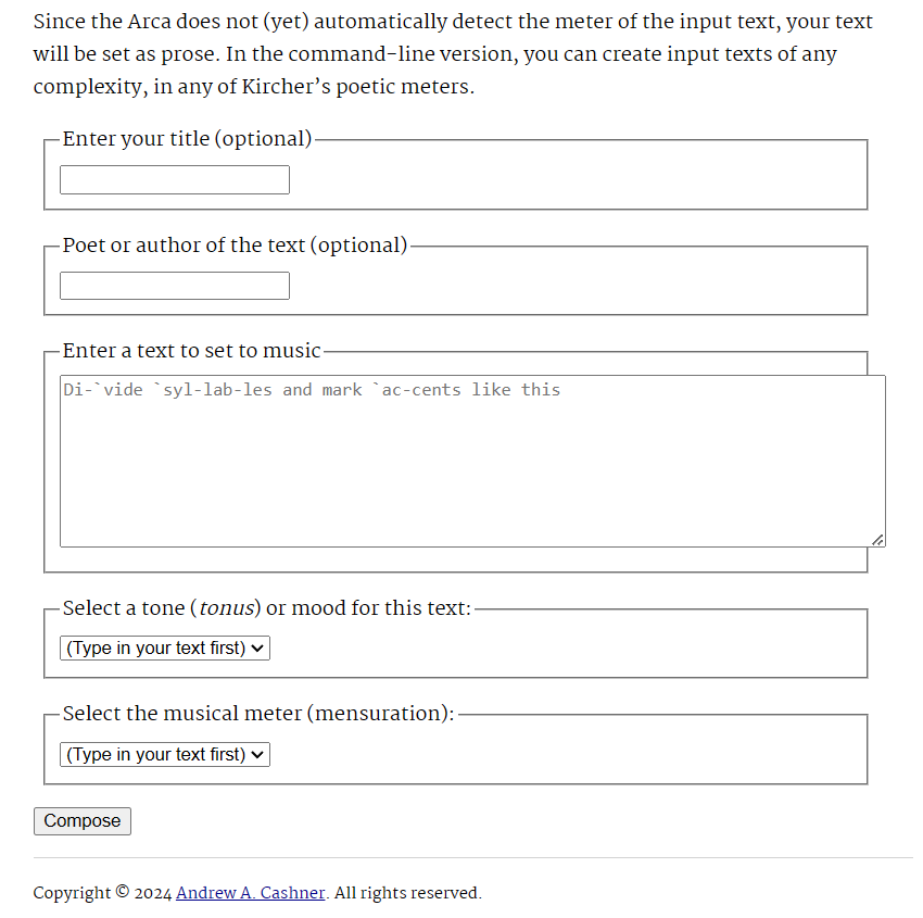 The Arca Musaritmica was a wooden music box where by lifting little wooden rods containing various data, one was able to put together piece of music. Andrew A. Cashner created a copy that runs on browser and can be accessed on https://www.arca1650.info/compose.html .