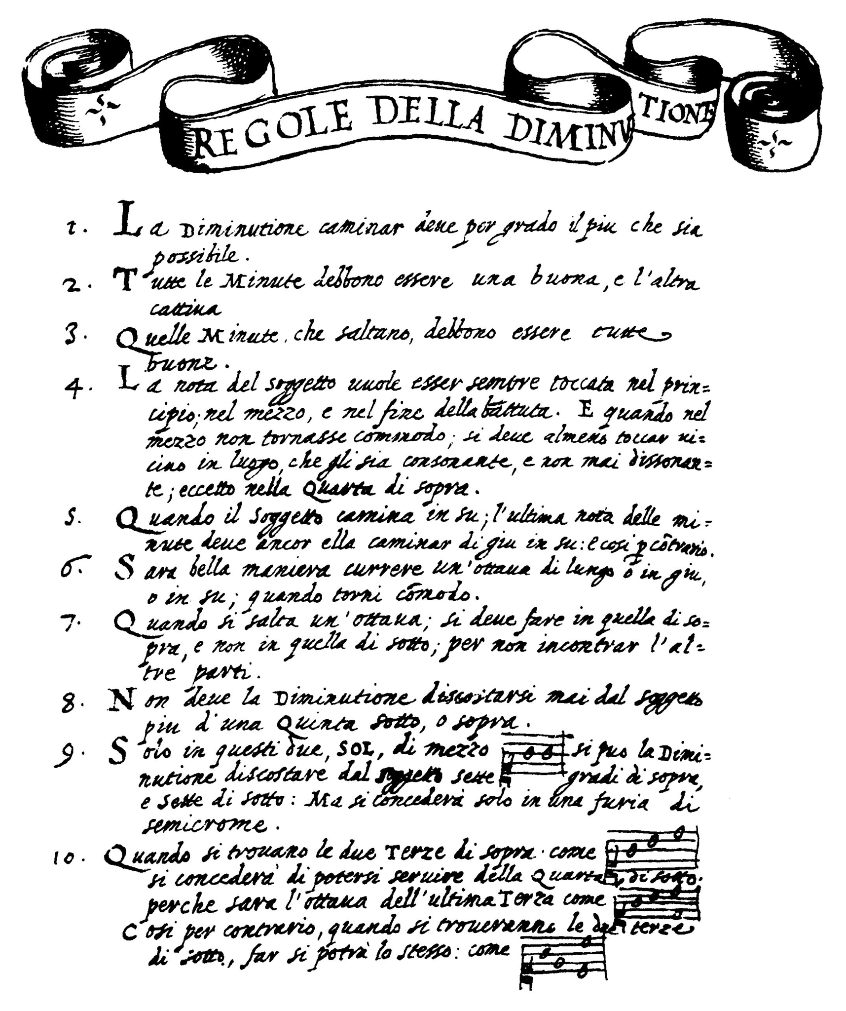 In Il Dolcimelo, the author Aurelio Virgiliano provides a short list of rules for generating diminution.