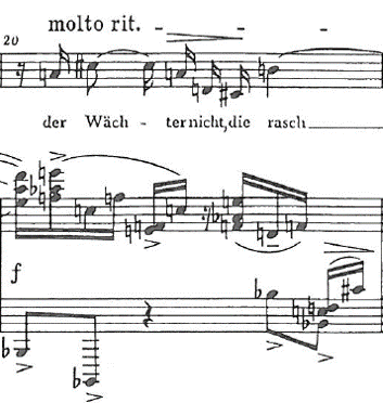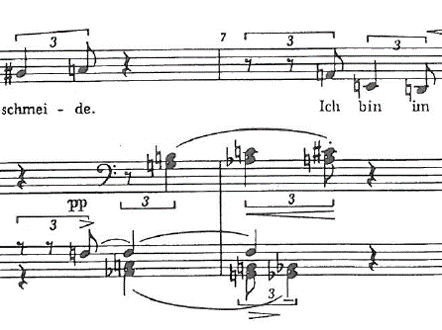 Audio example 52: Fassbaender & Reimann (1983). Arnold Schönberg: Das Buch der hängenden Gärten, Op. 15, No. XI, bars 13-16