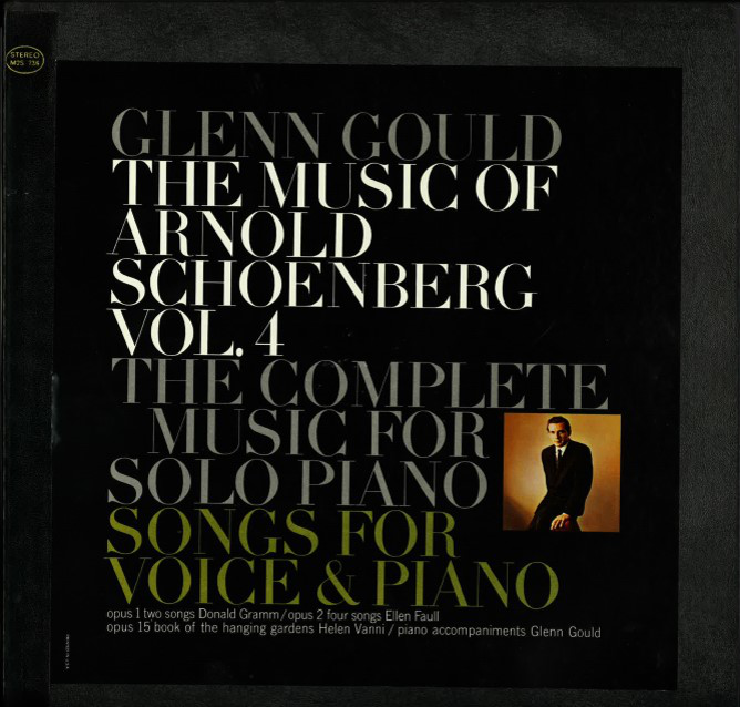 The recording of Opus 15 is part of a set of two LPs that belong to Columbia’s series “The Music of Arnold Schoenberg”. One LP contains Opp. 1, 2, and 15 with three different singers accompanied by Gould, the other Schönberg’s complete solo piano music performed by Gould. The cover art favours the pianist, possibly because of the second LP with solo piano music: Although the composer’s name is printed in a lighter colour and is thus more visible on the black background, both Gould’s and Schönberg’s names are written in capital letters of equal size, in contrast to the singers’ names that only appear in small print at the bottom. The only image is a photo of Gould.