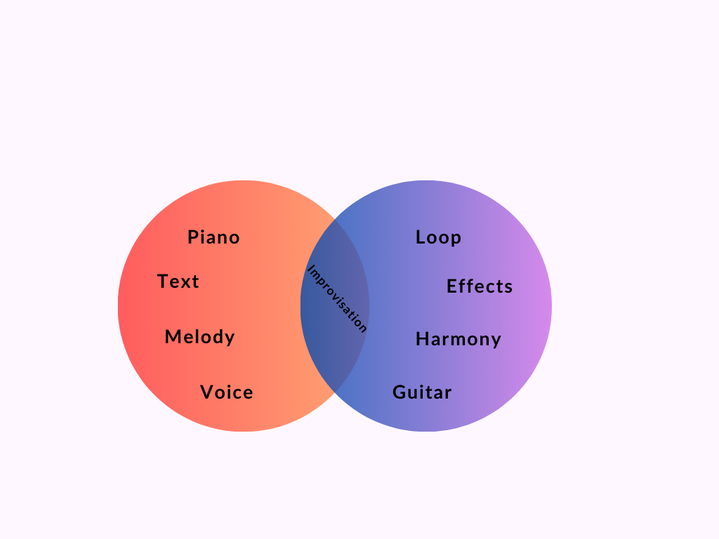 Within our creative process a kind of division of roles has been structured; on the one hand Corrado is responsible for the first creative input, suggesting a loop and looking for harmonic solutions on the guitar, on the other hand Sara suggests the first melodic ideas and takes care of recording and writing the melodic/harmonic material. This results in fewer disruptions to the compositional flow, as the harmonic and melodic material is attempted to be fixed practically as soon as it is born.