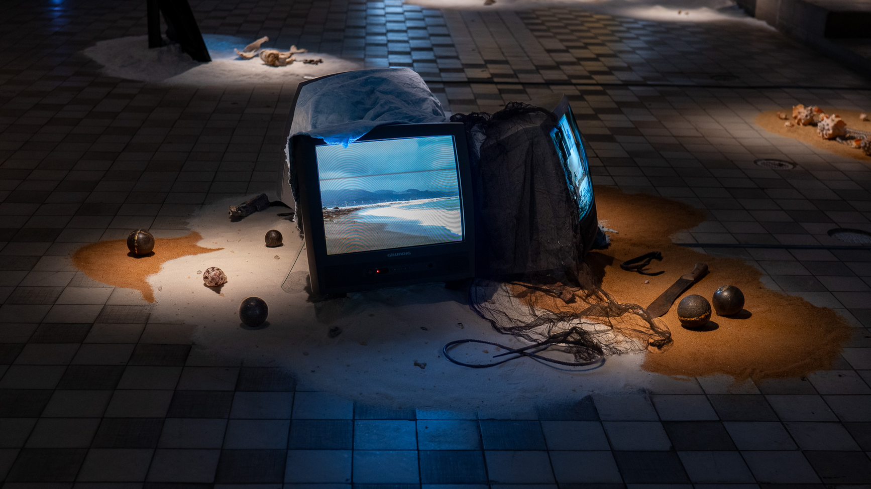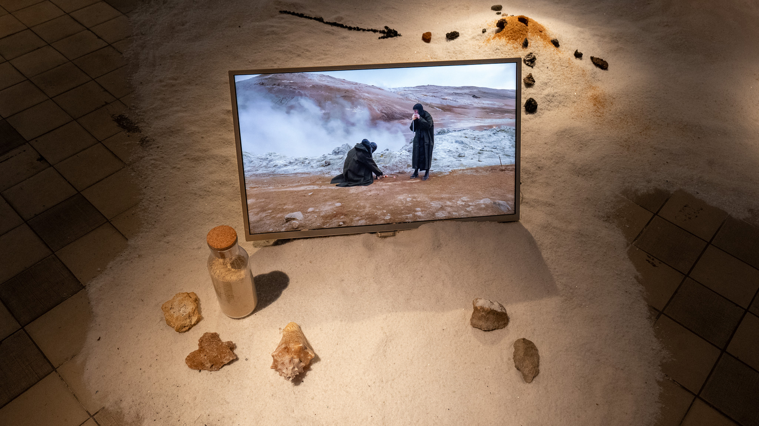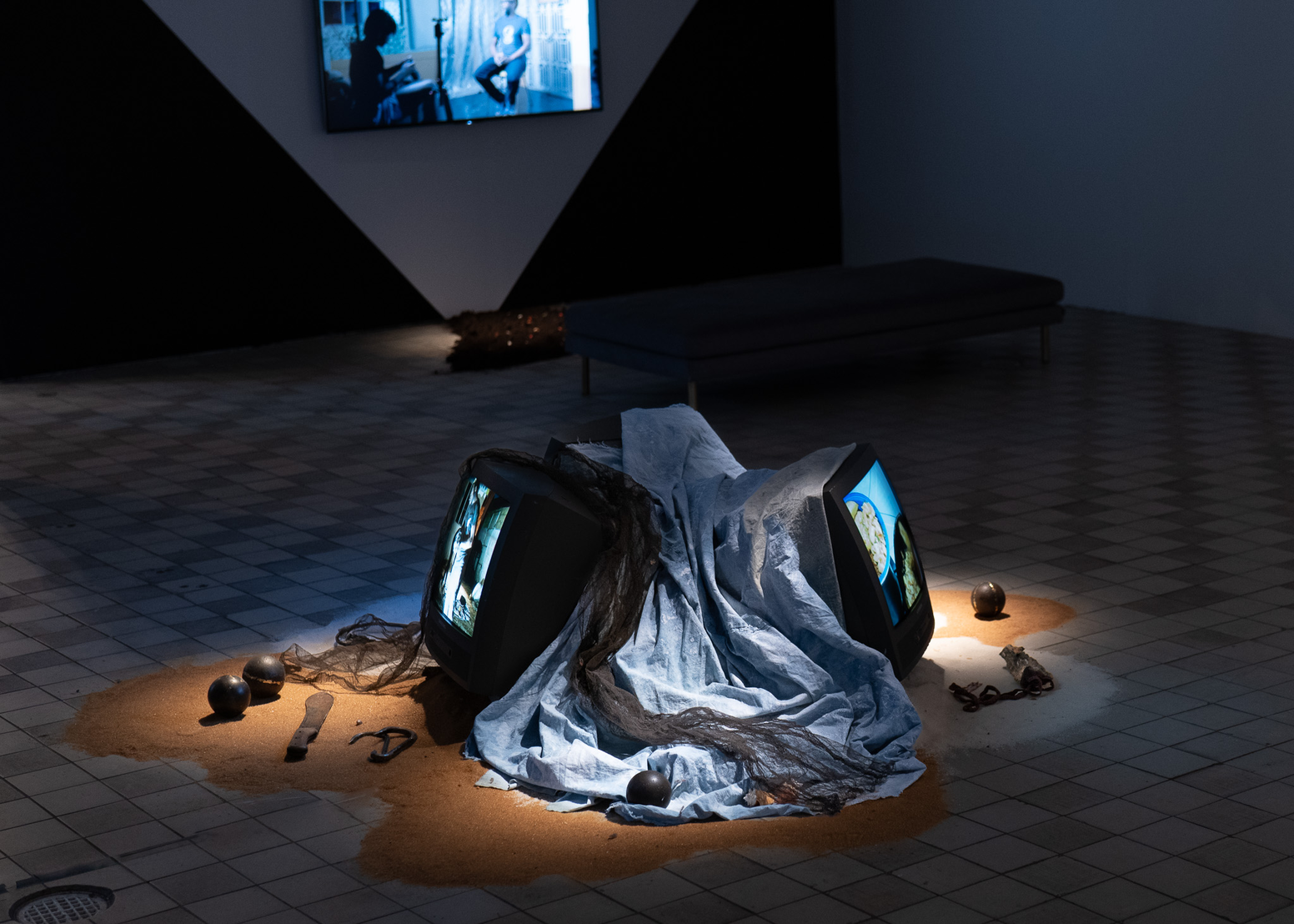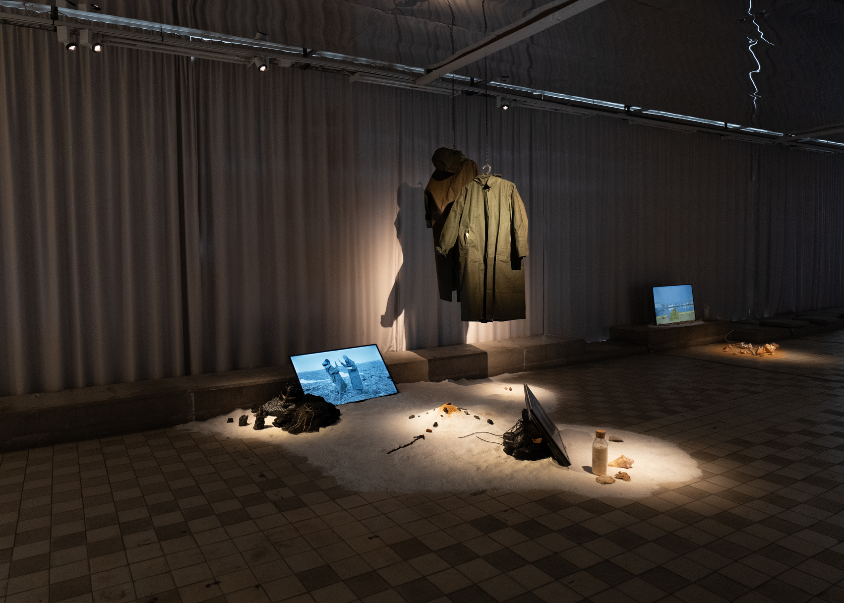 Ljuset Year: 2024 Medium: Exhibition Materials: Iclands of suagar and salt with tv screens with documentation of performance and performance objects. Ljuset (The Light) is this spring's first exhibition at Konsthall C. Here, the Nigerian-American artist Ayodamola Okunseinde meets the Jamaican-Swedish duo Whyte&Zettergren. These two practices explore violent historical and contemporary global conditions. Through interactive technology and ritual performance, Okunseinde and Whyte&Zettergren search above and beyond our world. Together they present a complex web of economic and political connections. Here, art becomes a starting point for change. Despite the exhibition's title, The Light does not offer any salvation for our time. It is the visitor, encountering the art, who can take the first step towards a solution. We at Konsthall C want to invite you as a visitor to find yourself, among the smoke, salt, sugar and fabric. You are the Light. About the artists Ayodamola Tanimowo Okunseinde (ayo) is a Nigerian-American artist, designer, anthropologist and time-traveler living and working in New York. His works range from painting and speculative design to physically interactive works, wearable technology, and explorations of “Reclamation”. He has exhibited and presented at the 11th Shanghai Biennale, Tribeca Storyscapes, EYEO Festival, Brooklyn Museum, M.I.T. Beyond the Cradle, and Afrotectopia amongst others. He is the co-founder and Director of Iyapo Repository, a resource library that exists in a nondescript future that was founded to collect and preserve artifacts to ensure the history and legacy of people of African descent. Whyte&Zettergren is an artistic duo comprising Jamaican dancer Olando Whyte and Swedish visual artist Rut Karin Zettergren. The duo’s artistic works constitute an ongoing investigation into the historical memory held by a place, material, and body. Their process visualizes the entanglement between geographically distant locations, objects, cultures, and times. Through their creative processes, they seek potential methods for healing historical trauma and strive to craft rites that envision possible futures. Whyte&Zettergren is currently working on their space-traveling program along with a video artwork on historical trauma and the collaborative research project Contingency Sample with Bryndís Björnsdóttir that explore extractivism in the era of the new space age. Their works have previously been performed and presented at various venues, including, and the Living Art Museum in Reykjavik (IS).