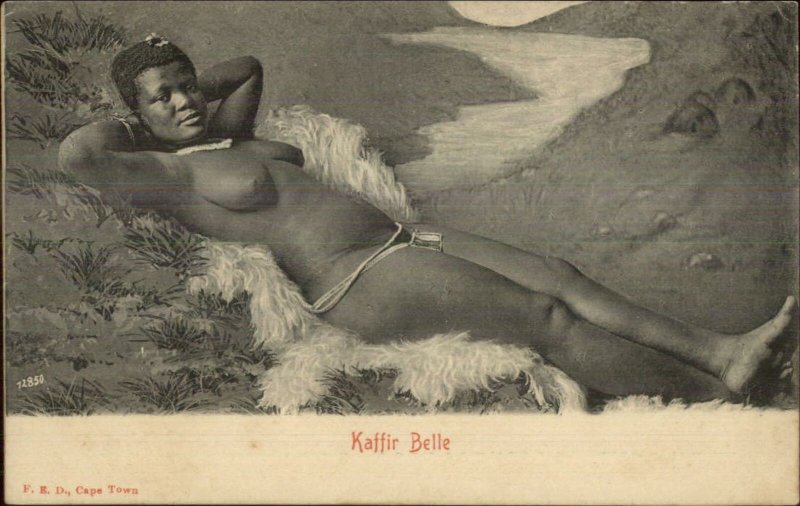 A postcard from the book of McKinley, C. E. (z.d.). The African Lookbook: A Visual History of 100 Years of African Women. A postcard of an African woman fetishized in colonial-era photography, objectified and reduced to stereotypes that reinforced colonial narratives.