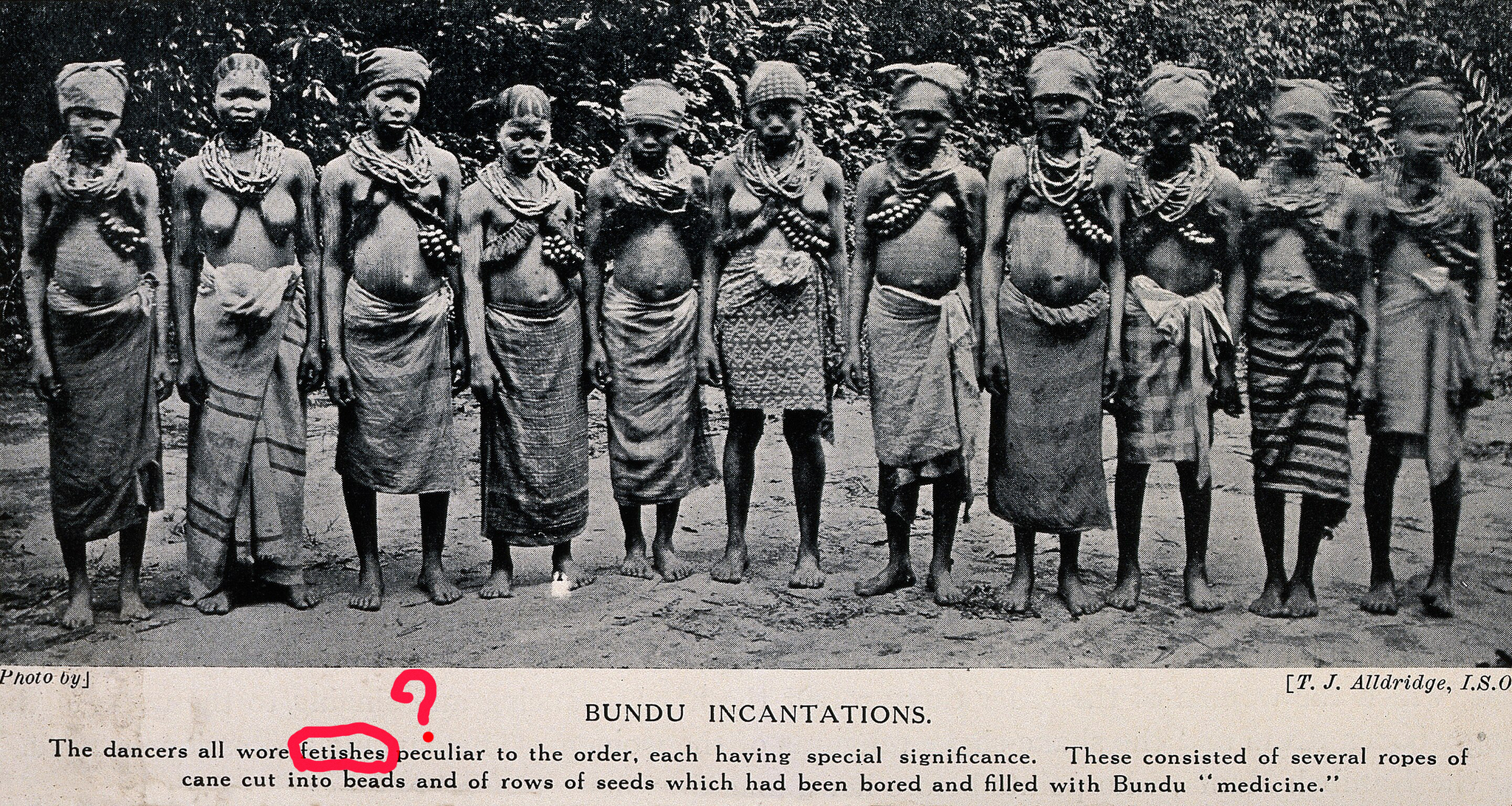 The 1st picture on the left illustrates the initiation process of the female Bundu society. The use of the term "fetishes" in this context shows how the word became a part of colonial thinking.