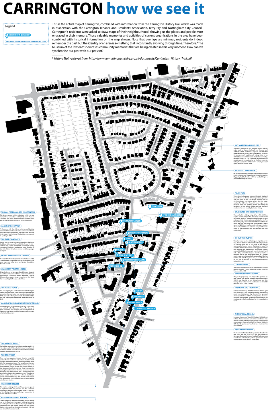 This exposition explores the role of creative practices in creating methods for public engagement and the promotion and recognition of tangible and intangible heritage at a local community level. It argues that principles of participatory design and co-creation have the power to contribute to community social cohesion and development. A literature review covering the main concepts and methods is introduced to provide an appropriate context for the main case study: Mapping Nottingham’s Identity. This research project includes the methodological and conceptual framework that were piloted and tested in collaboration with three localities within Nottingham (Sneinton, Carrington, and West Bridgford), including different stakeholders (community organisations, higher education, primary schools, local authorities, and the general public), producing a variety of outputs (a participatory methods’ toolkit, performative maps, community furniture, exhibition, websites) and reflecting on their role in creating meaningful interactions and place-making.
