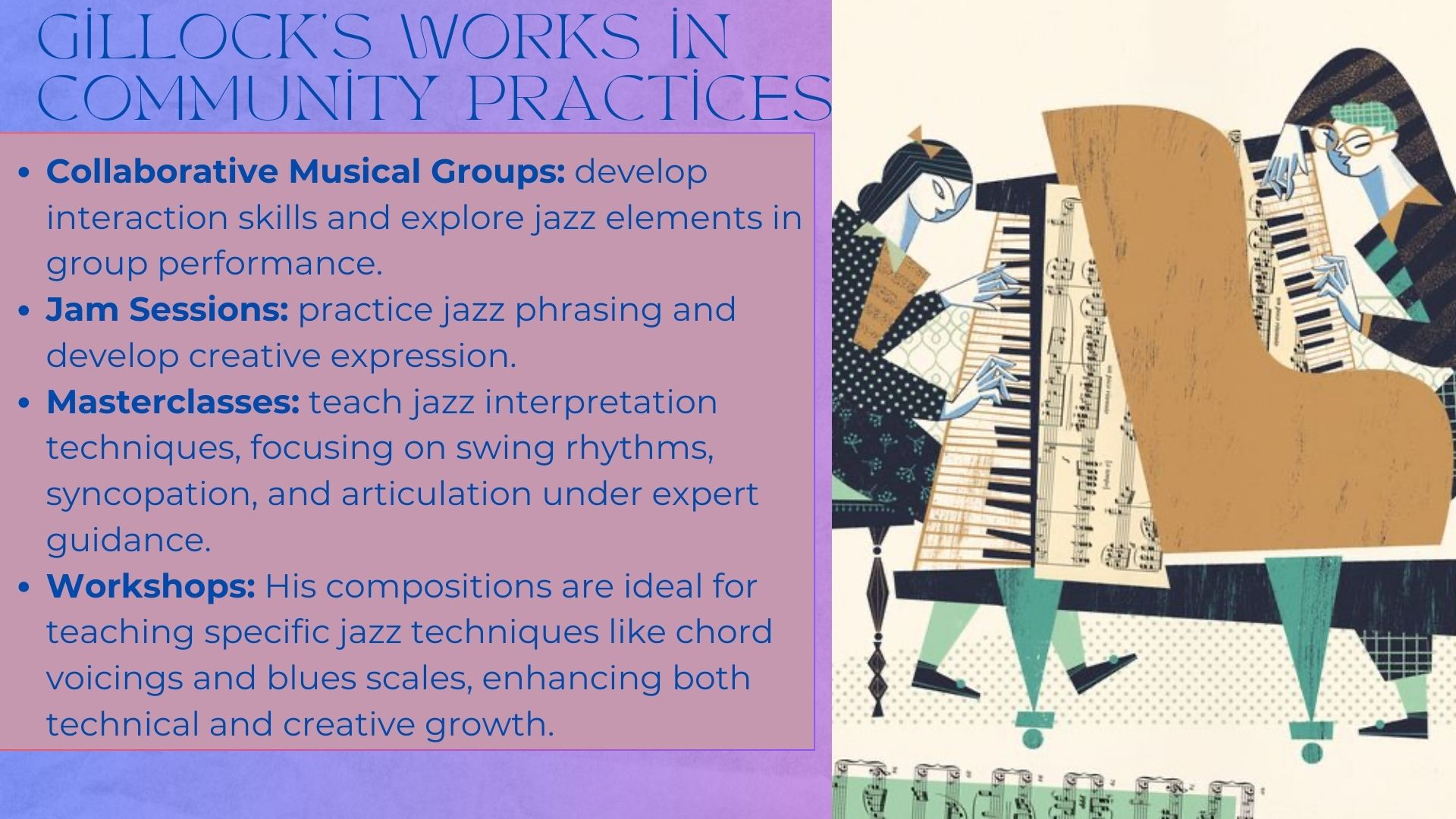 Workshops: Gillock's music, which is often used for technical development, can be integrated into workshops to teach specific jazz techniques such as chord voicings, phrasing, and the use of blues scales. This helps students apply these concepts to their performances.