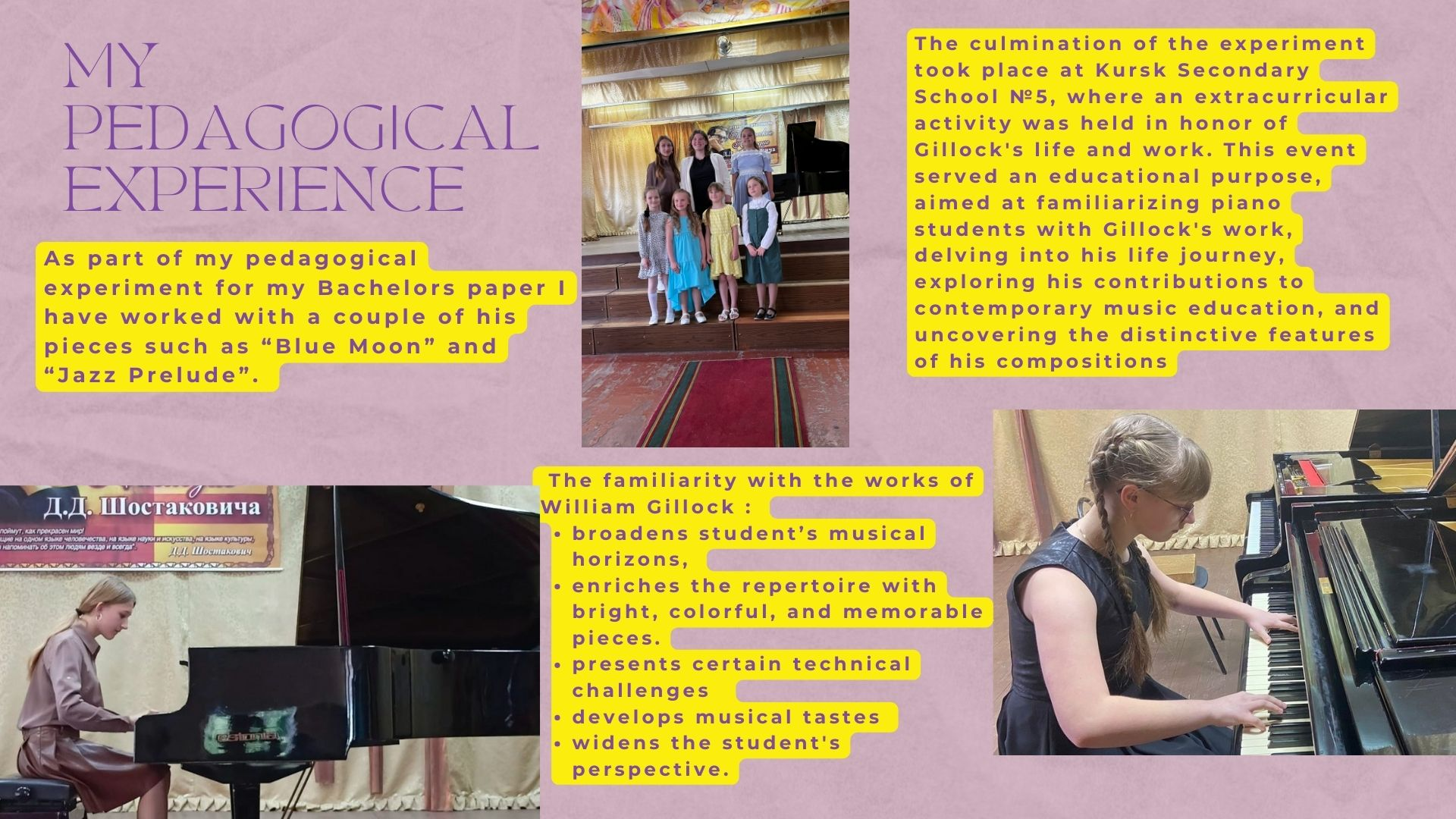 The culmination of the experiment took place at Kursk Secondary School №5, where an extracurricular activity was held in honor of Gillock's life and work. This event served an educational purpose, aimed at familiarizing piano students with Gillock's work, delving into his life journey, exploring his contributions to contemporary music education, and uncovering the distinctive features of his compositions. Furthermore, the students who had engaged in jazz-based exercises demonstrated remarkable proficiency by showcasing their abilities through the performance of jazz compositions.