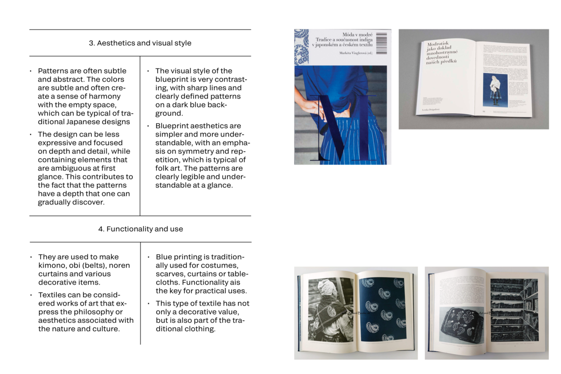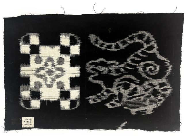 A gometric motif with a “Mon” or family crest in the central panel. Both patterns are applied using the “Kukuri-gasuri” (tie-dye) technique, respectively on the weft, weft, and warp threads (double-Kasuri), in white (natural) reserved on an indigo blue background.