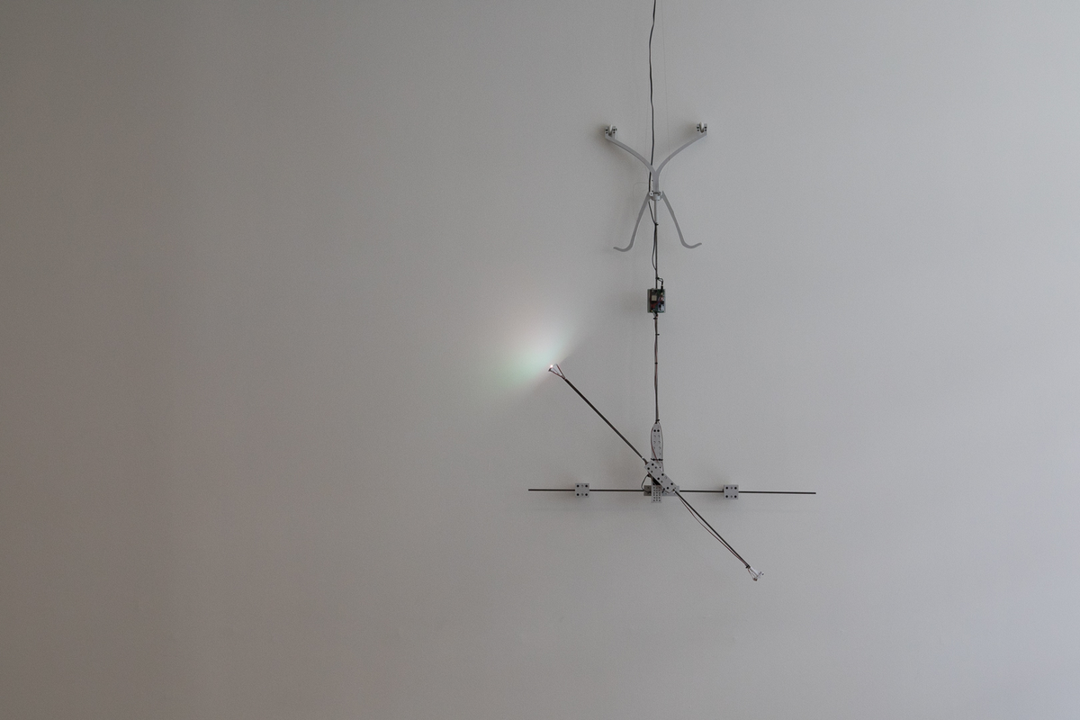 The second type is a sculpture suspended by eight wires that manipulates it in 3D space. Each wire goes from a sculptural element suspended in the air, equipped with an expressive end effector consisting of multiple moving limbs and an RGBW light source. The wires suspending the effector run to winches that pull on 1mm Dyneema wires. The winches are run by brushless DC motors controlled by FOC controllers that afford substantial dynamic potential.