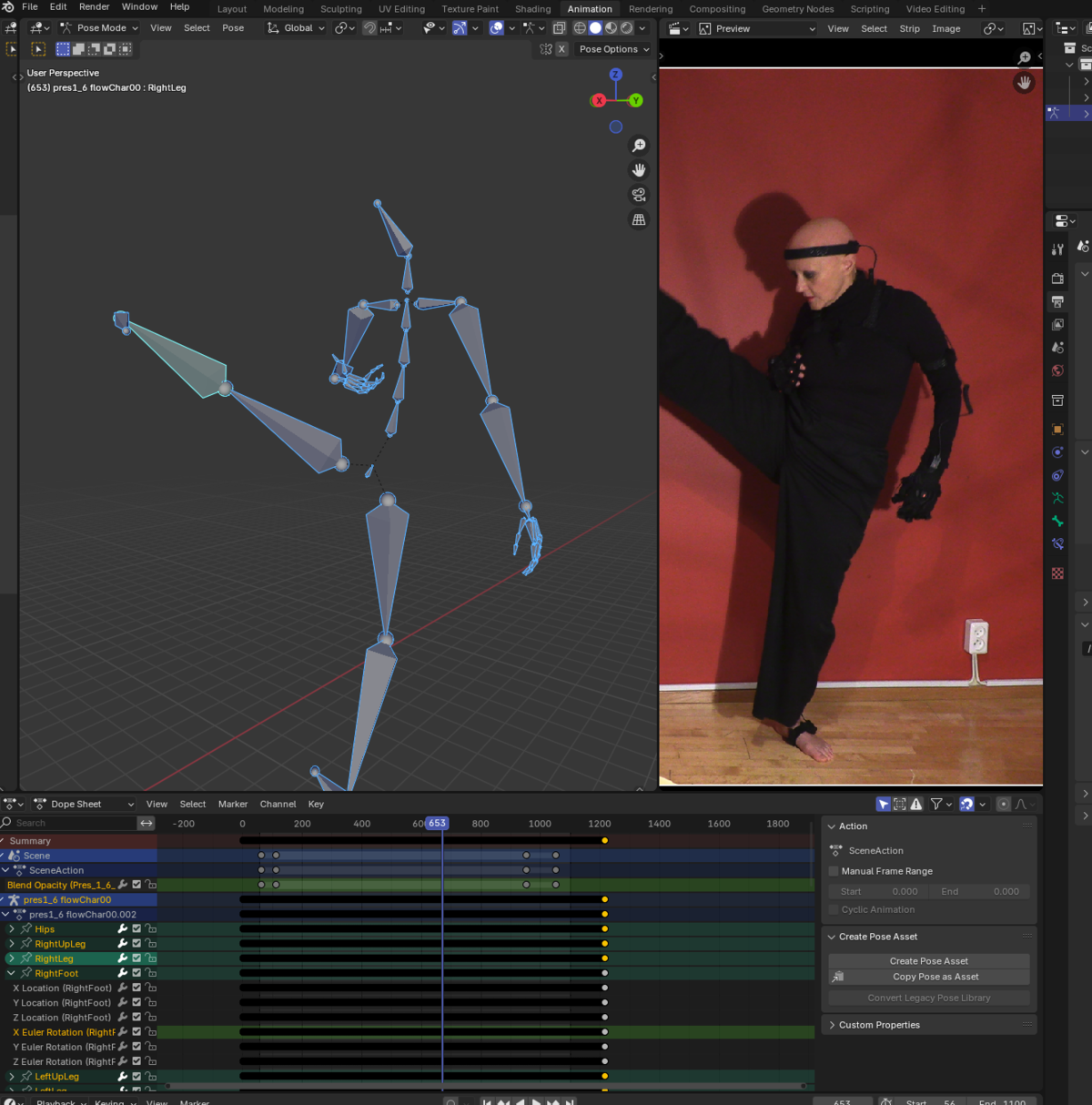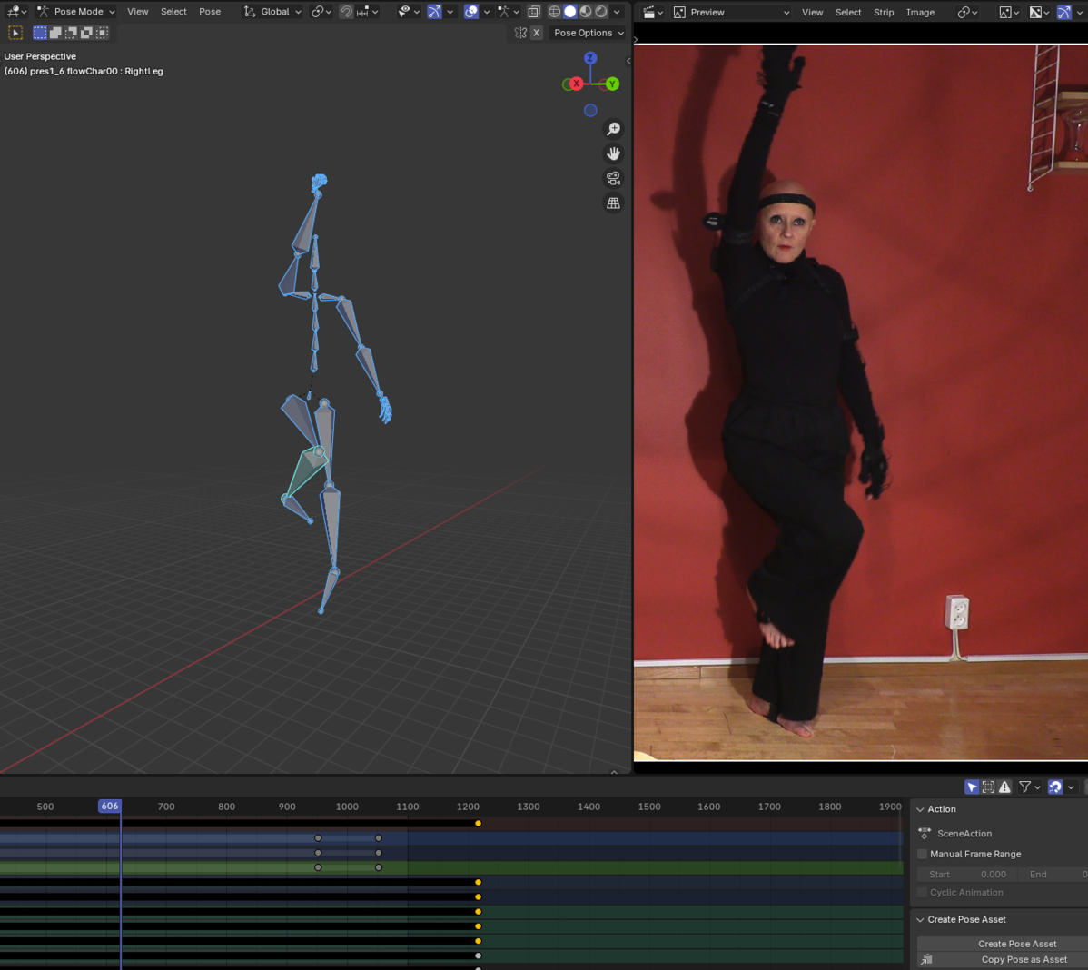 The data was cleaned up and synchronized with video documentation from the motion capture session using Blender.