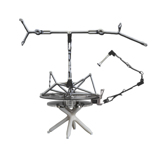 At the time of writing, two main types of sculptures have been developed. The first is an autonomous wheeled sculpture equipped with three omnidirectional wheels, allowing it to roam and orient itself in the performance space freely. In addition to 3 degrees of spatial movement (forward – backwards, left – right and rotation), the sculpture has 8 degrees of freedom utilizing various limbs. Lastly, it is equipped with an extra limb to illuminate itself and its surroundings.