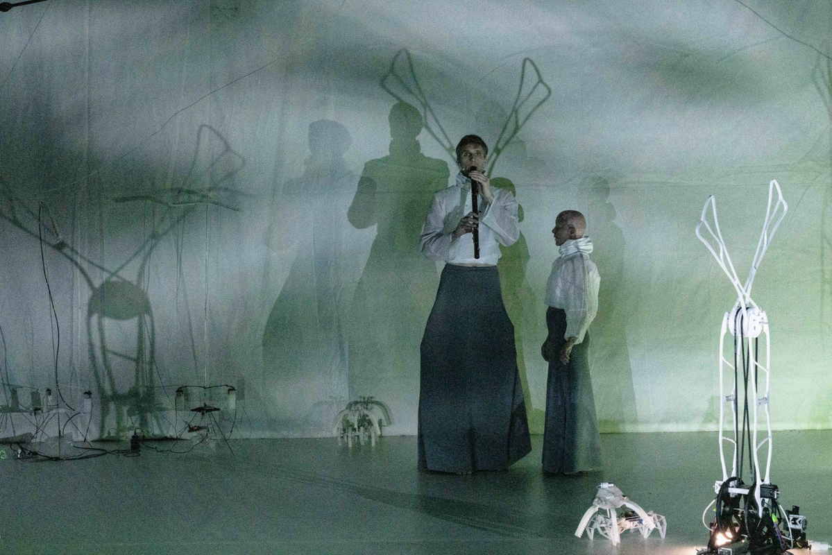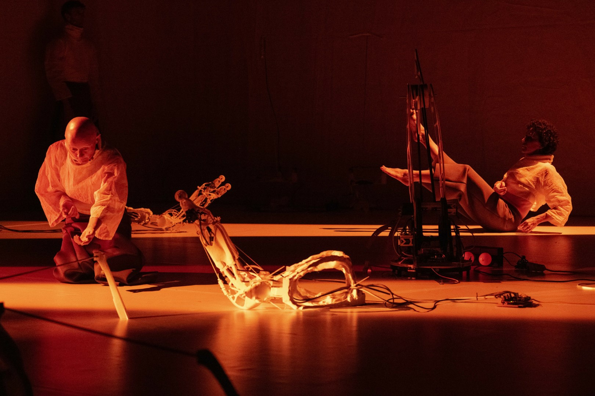 The performance feature the same human performer, Alwynne Pritchard, who provided the movements that were collected and mapped onto the partaking sculptures.