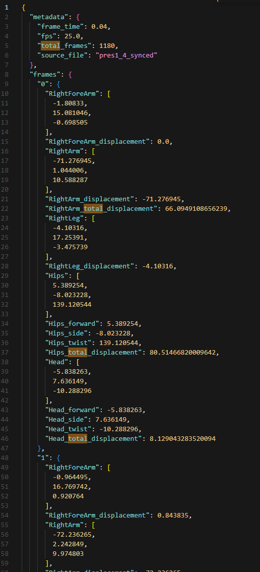 The JSON file includes metadata about the animation (frame rate, total frames, source file). The JSON file is generated by a Python program that takes the extracted BHV file as input and writes the movement of the specified joints over time. The joints that will be extracted from the source BVH file are given as parameters when initializing the program. For each frame in the BVH file, the values for the specified joints are written as a numbered entry in the JSON file.