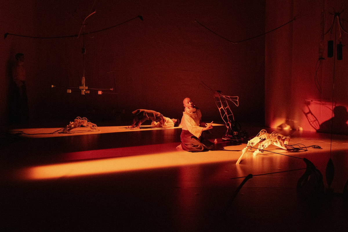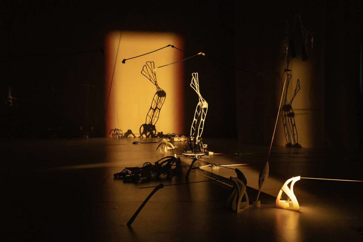 The kinetic sculptures can perform autonomously but are also intended to perform alongside the human performer whose movements they mimic.