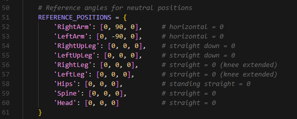 In addition, a parameter named total_displacement is calculated for each joint. The total_displacement provides a single value that indicates the overall movement of a joint from its neutral position, regardless of which axis the rotation occurred on. This calculates the Euclidean distance between two points in 3D space: the current joint and reference angles given as parameters as the program starts.