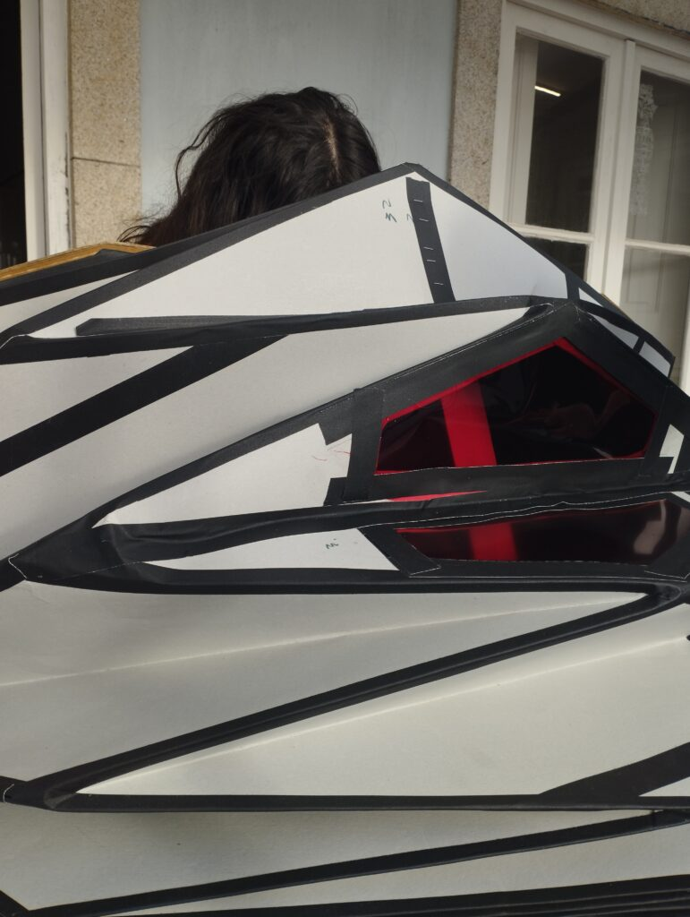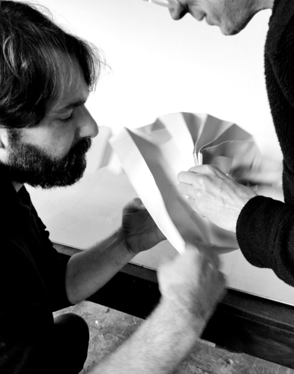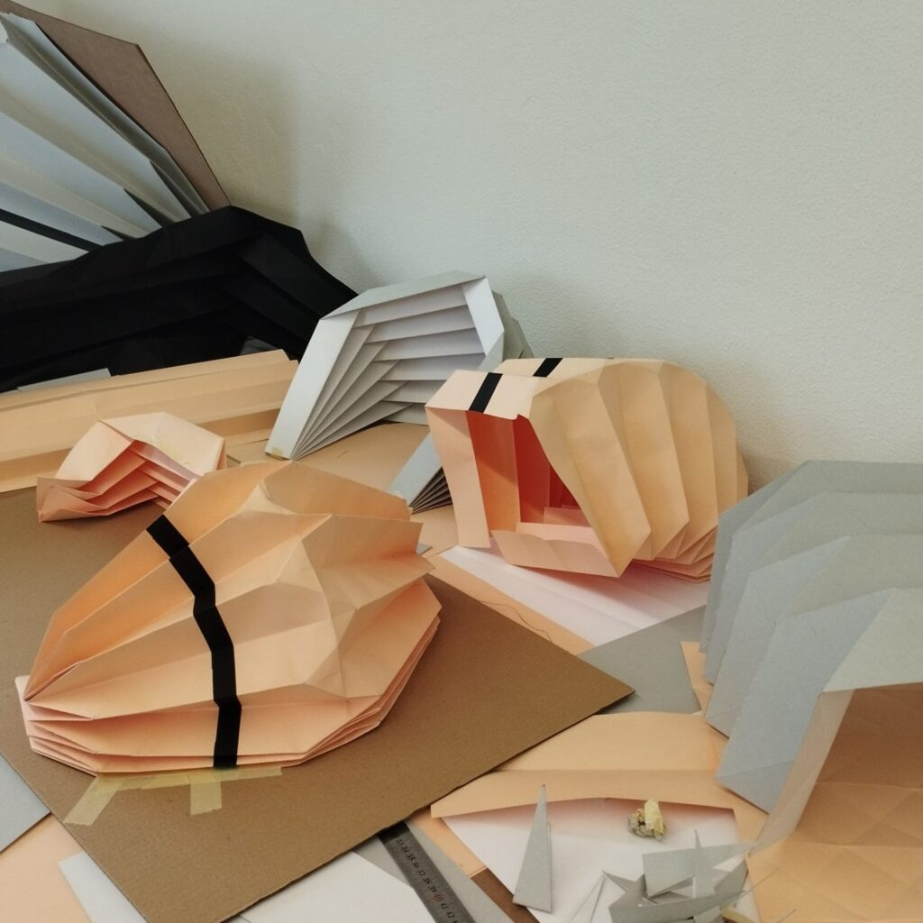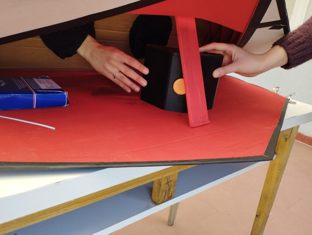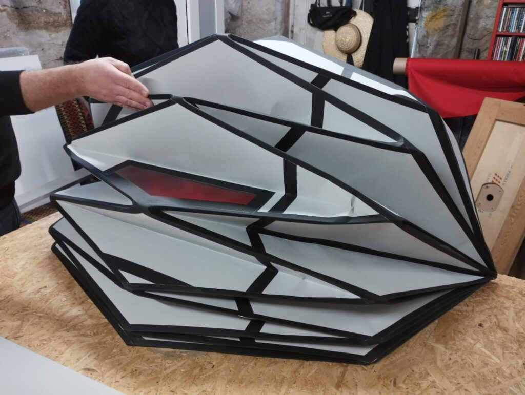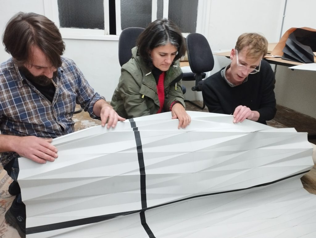 We based our work on some origami and kirigami techniques of folding paper and folding cardboard. in this case. so it will be an object that is transportable and light and with materials that are accessible and affordable and not very complicated. try not to do something very industrial, so that anyone can replicate it. It’s one of the main principles. and also try not to use materials that are non ecological and plastics.