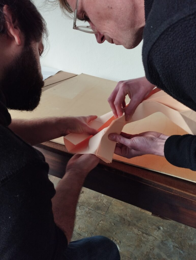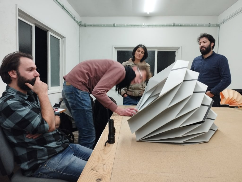 It’s not a closed project so it’s open to lots of variations. That’s one of the main issues. We’re trying to build a fractal thing so it can be oversized or diminished, amplified. can suit a lot of questions too. I think it’s the beginning of something that can improve. Whether this project continues or not I spent a week learning origami. And this project can become another project or several other projects. It shouldn’t close on itself. That’s one of the issues we were discussing, we’re trying to build this and put it on an open source so that anyone can build the same or with the same materials or other materials. It will be a free template for other who want to build something like this. They have the beginning of it.