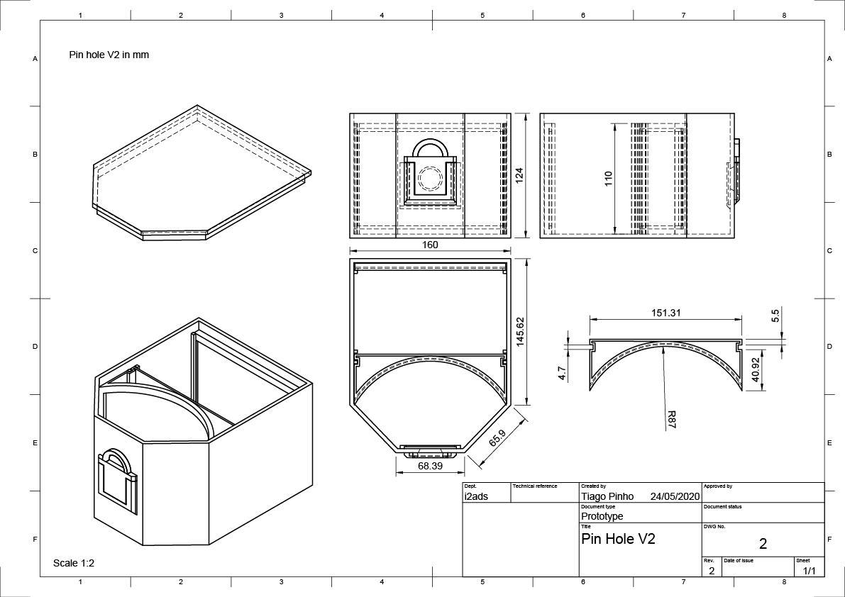The technical knowledge applied to the design and construction of the second pinhole demonstrated that it is possible to build a device capable of producing well-defined images with few distortions. By resorting to DiY, the process is open, documented, and can thus be learned, replicated, and adapted. The use of bioplastic can further open the discussion and reflection on the sustainability of the process. Above all, it is about prototyping a model that can be developed on other scales and materials. In this sense, some of the characteristics that the pinhole provides can be rescued, namely the uncertainty and variability of results, combined with the possibility of using any object to produce images. Nevertheless, this prototype allows for modifications to the camera itself, capable of instigating the exploration of the most diverse variables.