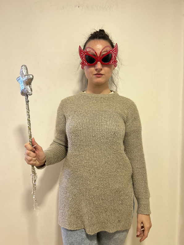 When I went to the theater that I work to try on new costumes and accessories, I had some costume and accessory alternatives in mind. For example, the wand you will see below was an accessory I wanted to try instead of the cane. (The reasons and insights that came up after the experience are explained below.) Some accessories and costumes, however, I intiutively wanted to try when I saw them. Even though I didn’t have clear reasons at that moment, for example, there was something that drew me to the color red. (You will see below.) All these experiments and analyses I did, both intiutively and analytically, are listed below.